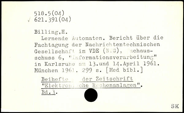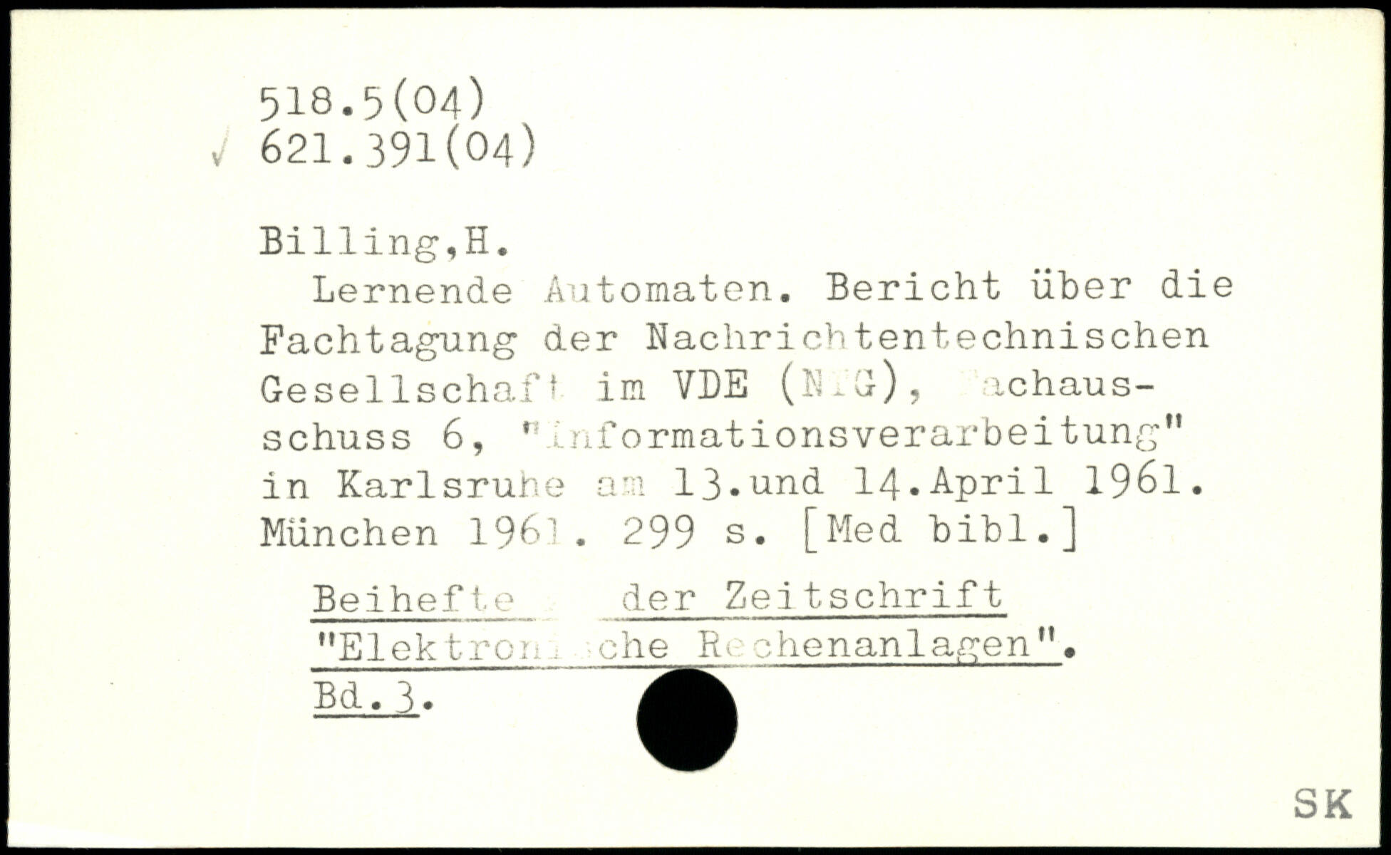 Lernende Automaten. Bericht über die Fachtagung der Nachrichtentechnischen Gesellschaft im VDE (Nid), achaus-schuss 6, nlnformationsverarbeitung" in Karlsrune am 13.und 14.April 1961.