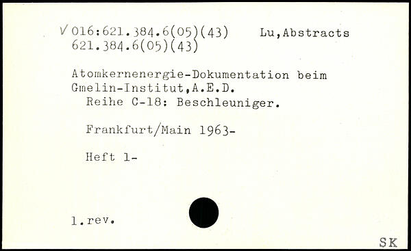 Atomkernenergie-Dokumentation beim Gmelin-Institut,A.E.D. Reihe C-18: Beschleuniger. Frankfurt/Main 1963- Heft 1-