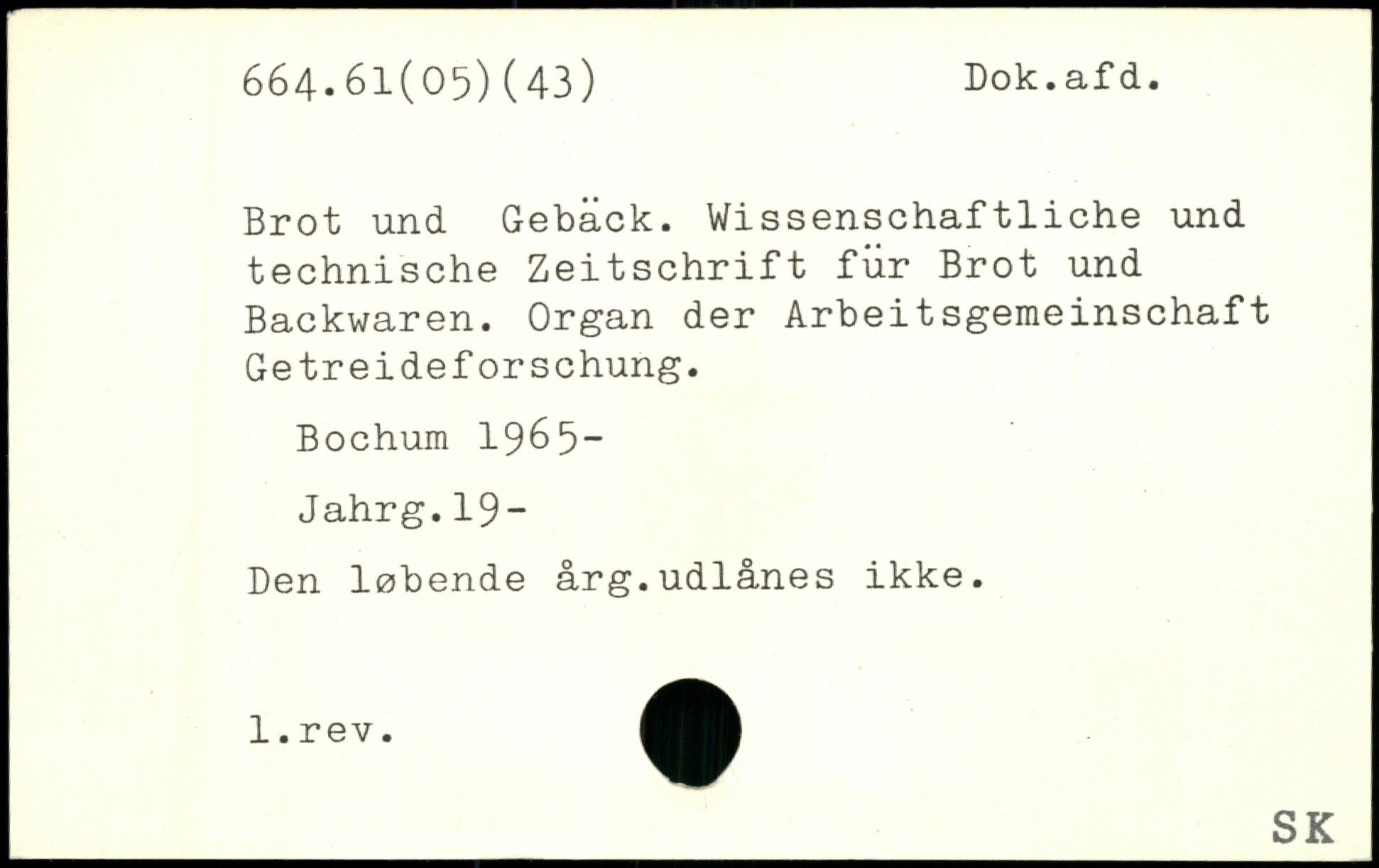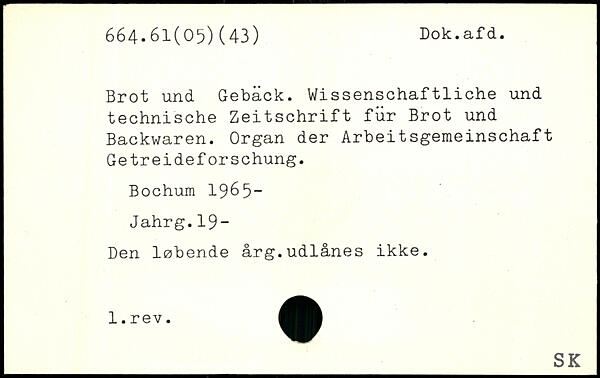 Brot und Gebäck. Wissenschaftliche und technische Zeitschrift für Brot und Backwaren. Organ der Arbeitsgemeinschaft Getreideforschung. Bochum 1965- Jahrg.19- Den løbende årg.udlånes ikke.