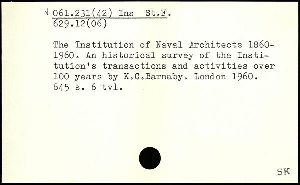 The Institution of Naval Architects 1860-1960. An historical survey of the Institutions transactions and activities over 100 years hy K.C.Barnahy.
