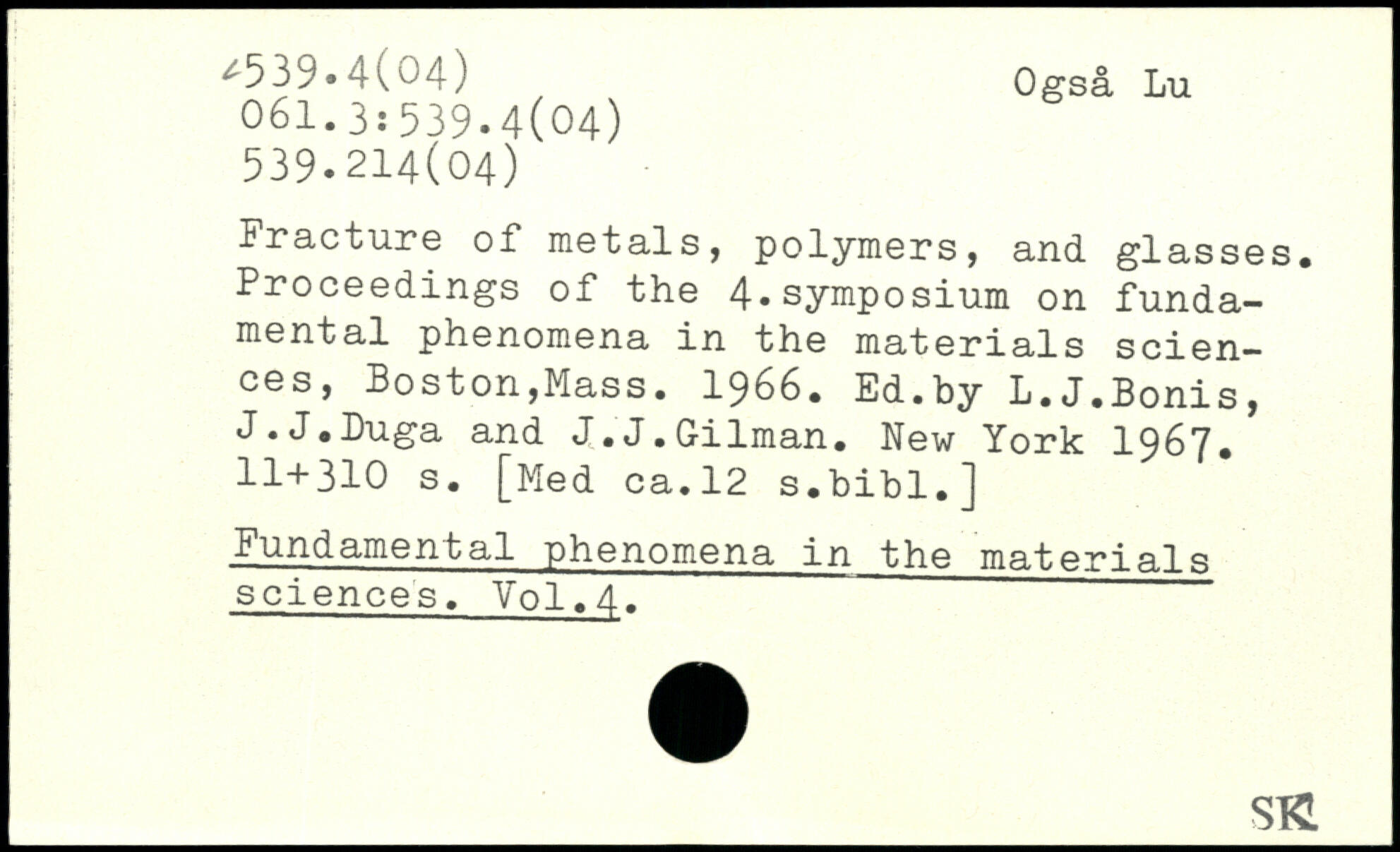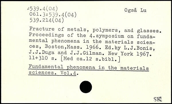 Fracture of metals, polymers, and glasses. Proceedings of the 4.symposium on fundamental phenomena in the materials sciences, Boston,Mass. 1966. Ed.by L.J.Bonis, J.J.Duga and J.J.Gilman.