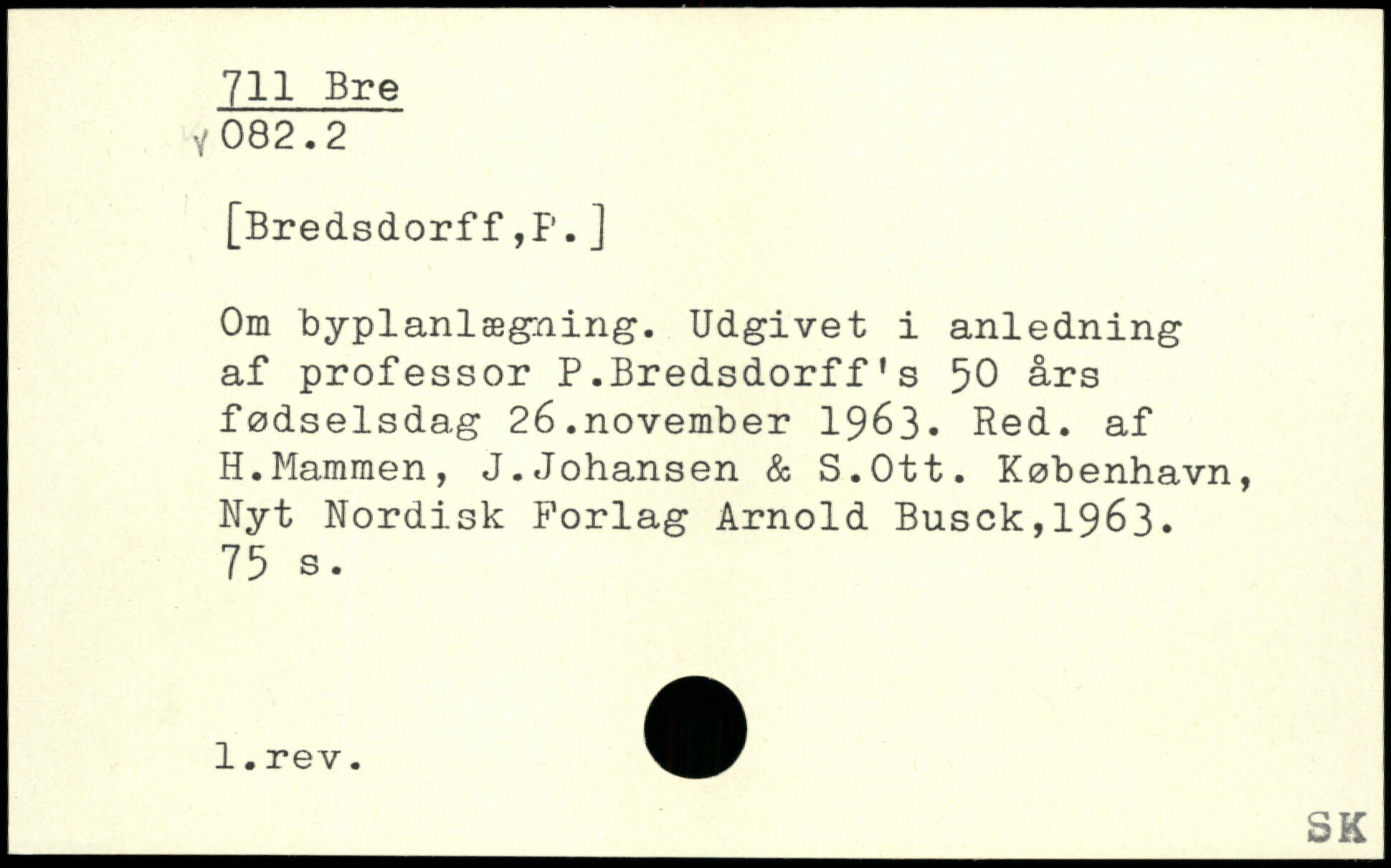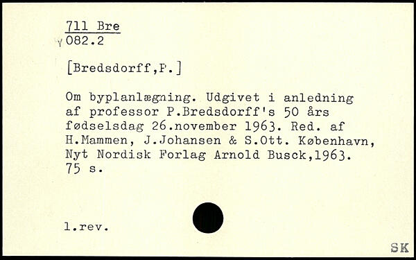 [Brededorff,F.J Om byplanlægning. Udgivet i anledning af professor P.Bredsdorff’s 50 års fødselsdag 26.november 1963. Red. af H.Mammen, J.Johansen & S.Ott. København, Nyt Nordisk Forlag Arnold Busck,1963.
