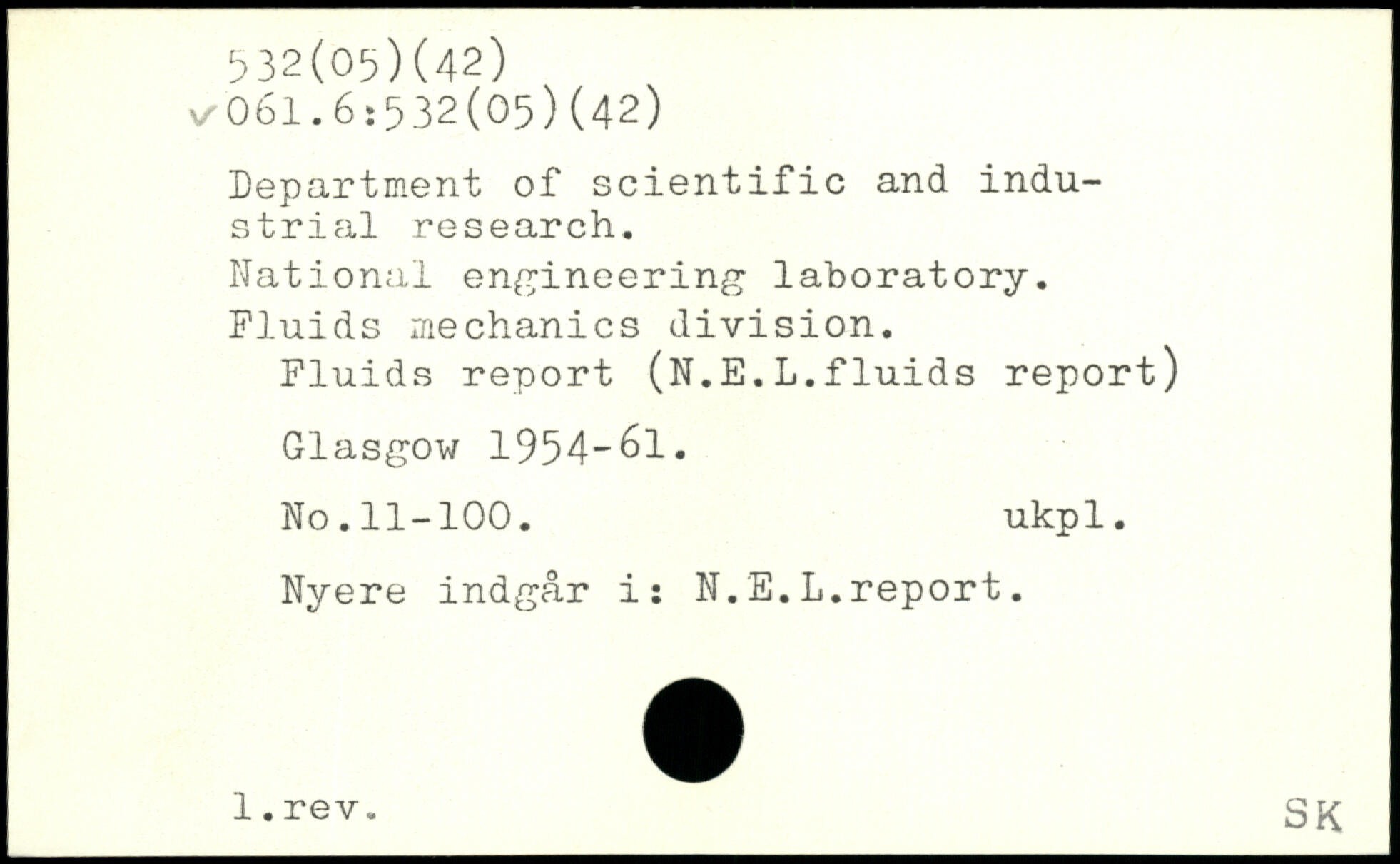 Department of scientific and industrial research. National engineering laboratory. Fluids mechanics division. Fluids report (N.E.L.fluids report) Glasgow 1954-61. No.11-100. ukpl. Nyere indgår i: N.E.L.report.