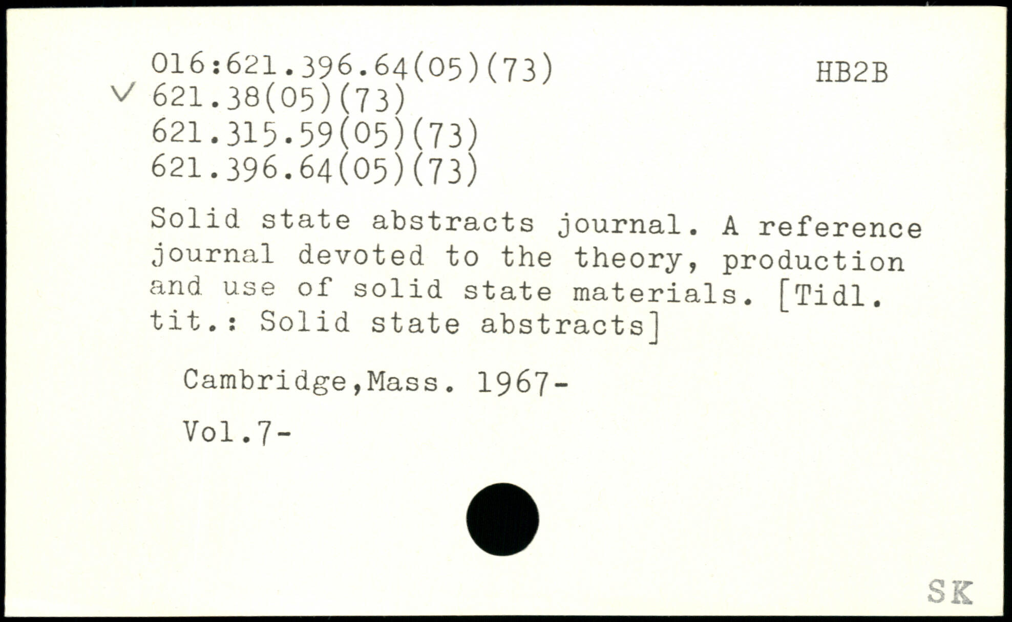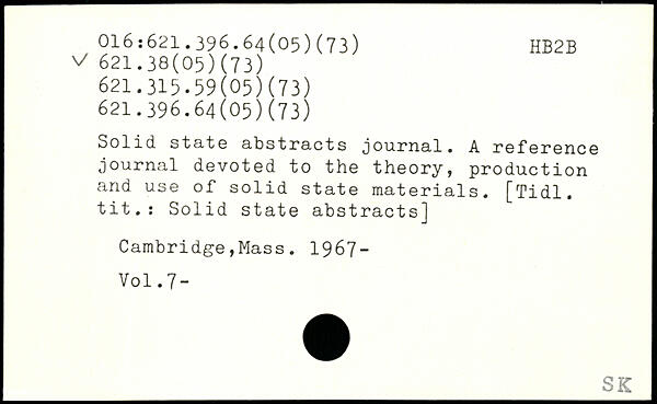Solid state abstracts journal. A reference journal devoted to the theory, production and use of solid state materials. [Tidl. tit.: Solid state abstracts] Cambridge,Mass. 1967-