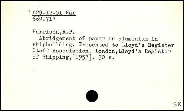 Abridgement of paper on aluminium in shipbuilding. Presented to Lloyd’s Register Staff Associations London,Lloyd’s Register of Shipping,f1957]