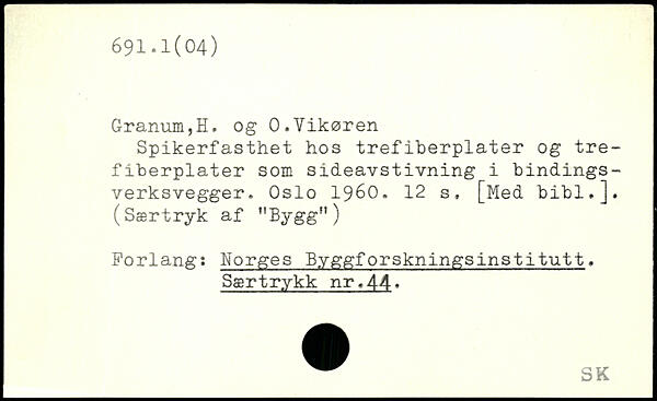 Spikerfasthet hos trefiberplater og tre-fiberplater som sideavstivning i bindings-verksvegger. Oslo 1960.