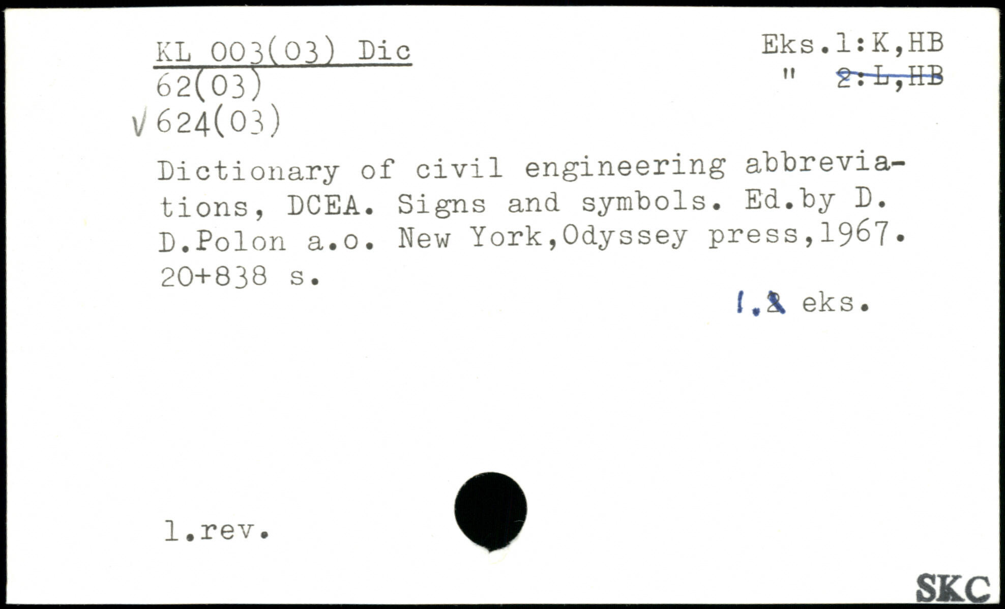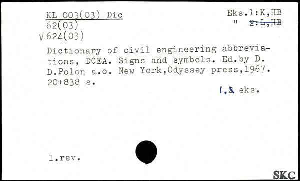 Dictionary of civil engineering abbreviations, DCEA. Signs and symbols. Ed.by D. D.Polon a.o. New York,Odyssey press,19&7.
