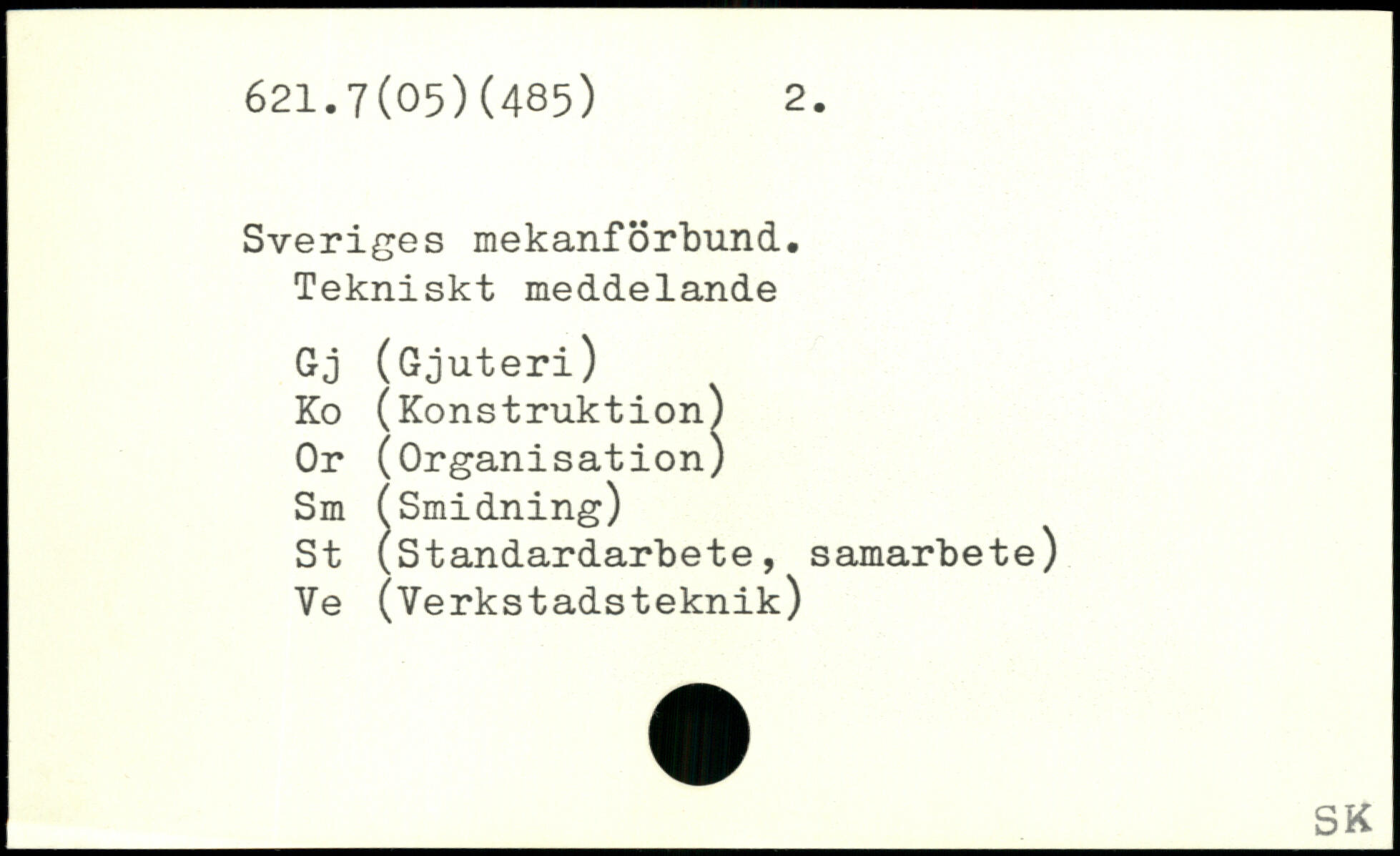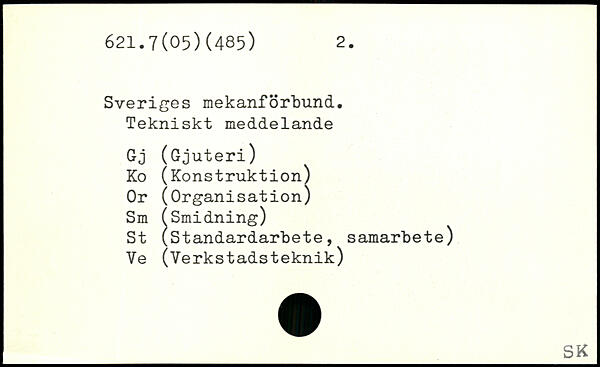 Sveriges mekanförbund. Tekniskt meddelande Gj (Gjuteri) Ko (Konstruktion) Or (Organisation) Sm (Smidning) St (standardarbete, samarbete) Ve (Verkstadsteknik)