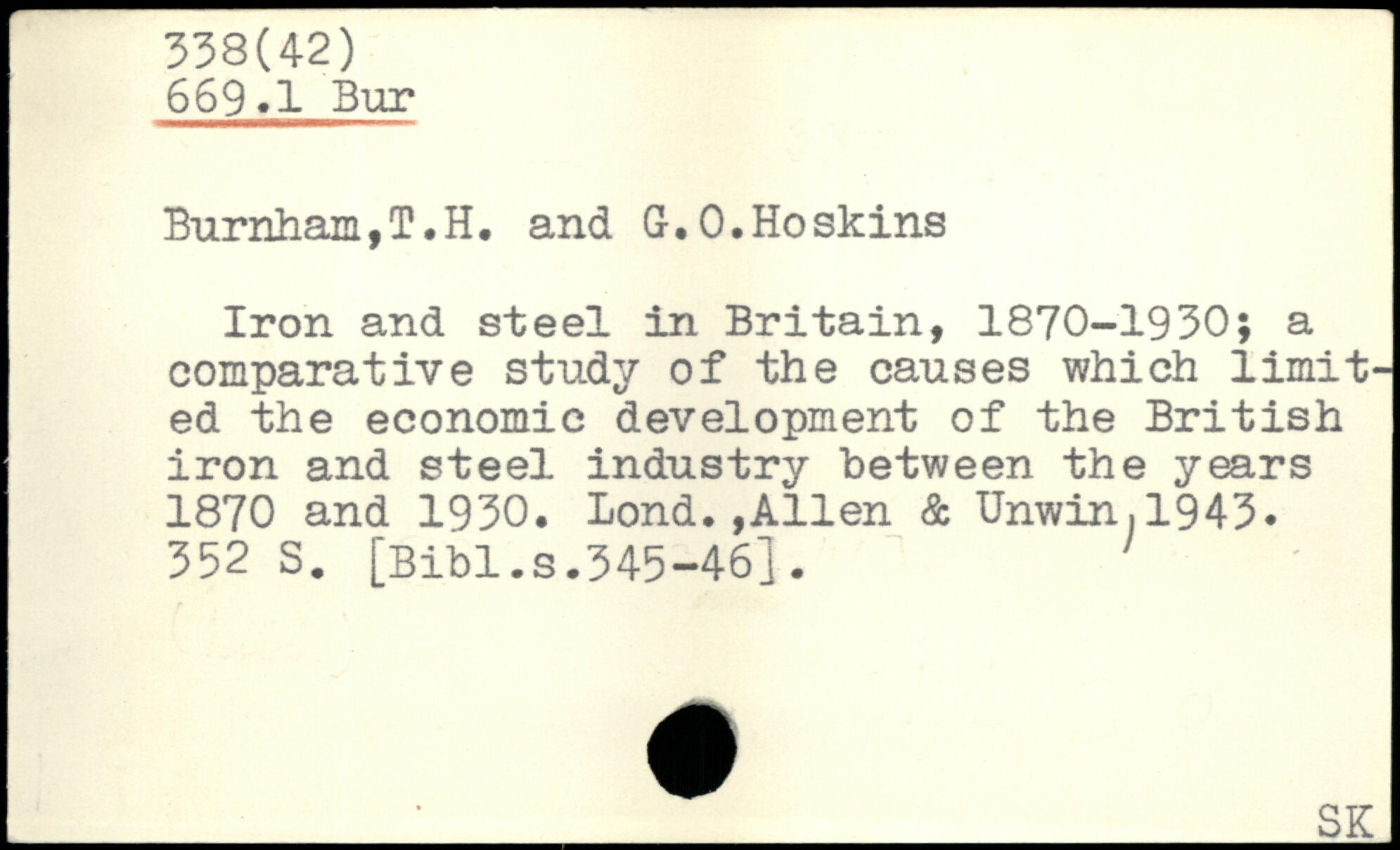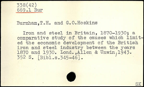 Iron and steel in Britain, 1870-1930; a comparative study of the causes which limited the economic development of the British iron and steel industry between the years 1870 and 1930. Bond.,Alien & Unwin.1943.