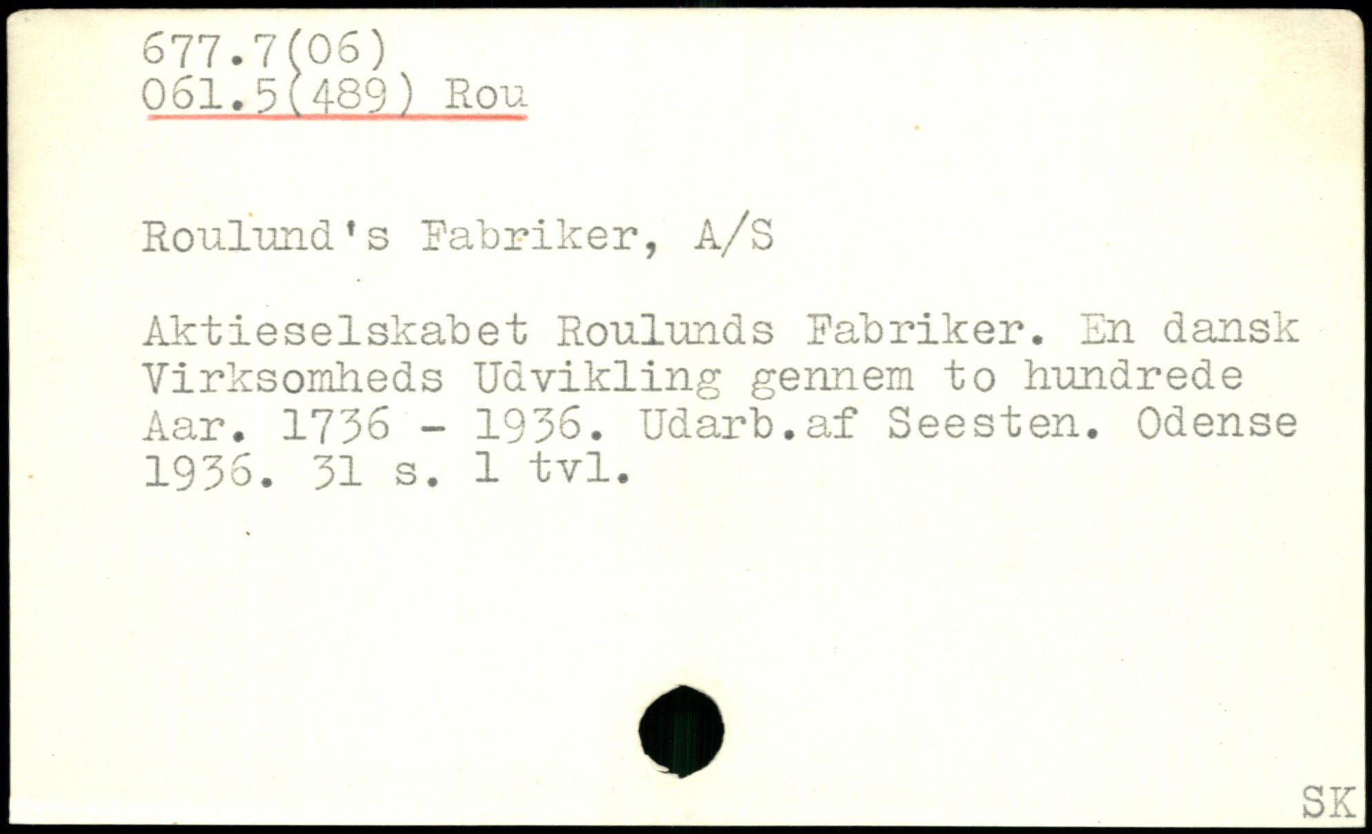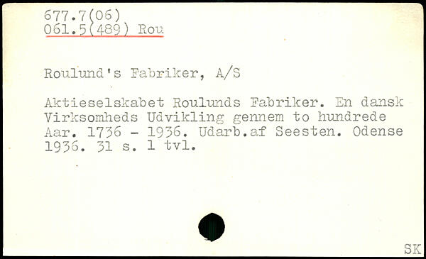 Aktieselskabet Roulunds Fabriker. En dansk Virksomheds Udvikling gennem to hundrede Aar. 1736 - 1936. Udarb.af Seesten. Odense 1936.