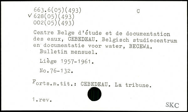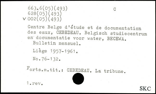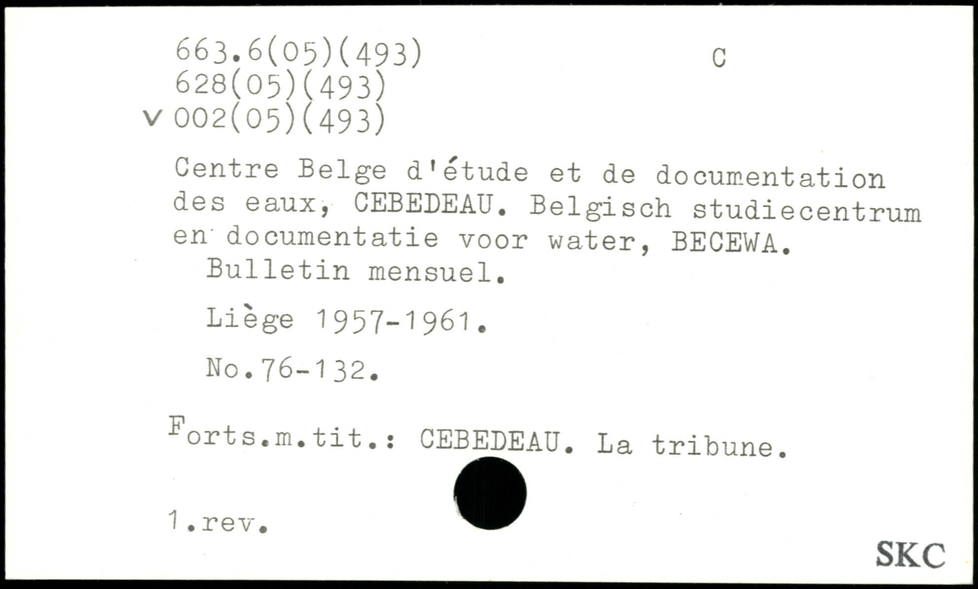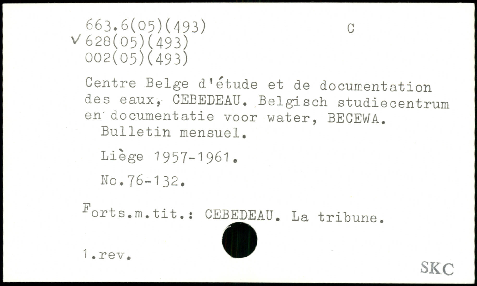 Centre Belge d'etude et de documentation des eaux, CEBEDEAU. Belgisch studiecentrum en' documentatie voor water, BECEWA. Bulletin mensuel. Liège 1957-1961. No.76-132. orts.m.tit.: CEBEDEAU. La tribune.