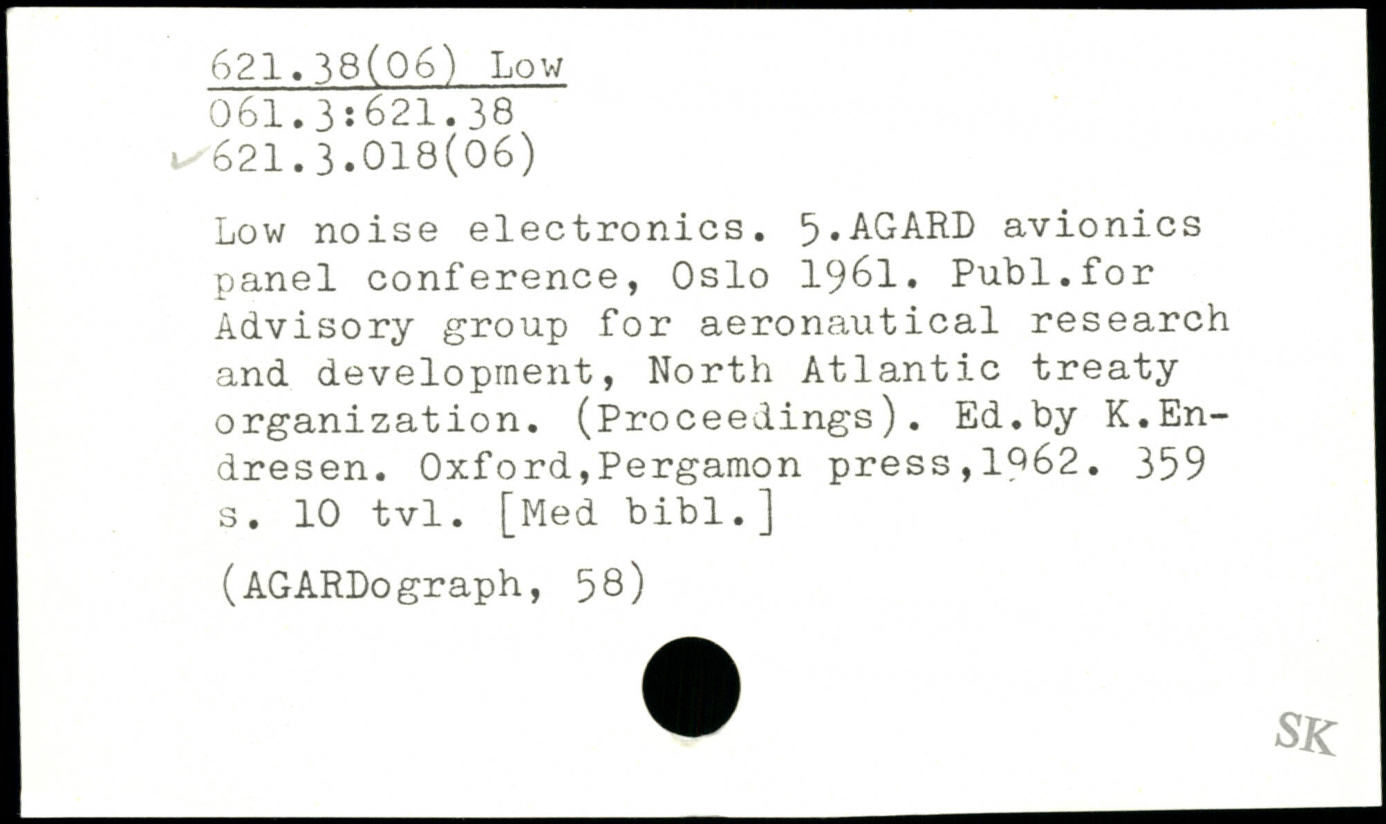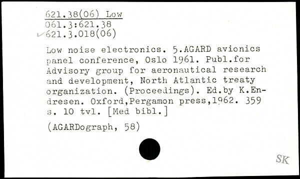 Low noise electronics. 5.AGARD avionics panel conference, Oslo 1961. Publ.for Advisory group for aeronautical research and development, North Atlantic treaty organization. (Proceedings). Ed.by K.En-dresen. Oxford,Pergamon press,1^62.