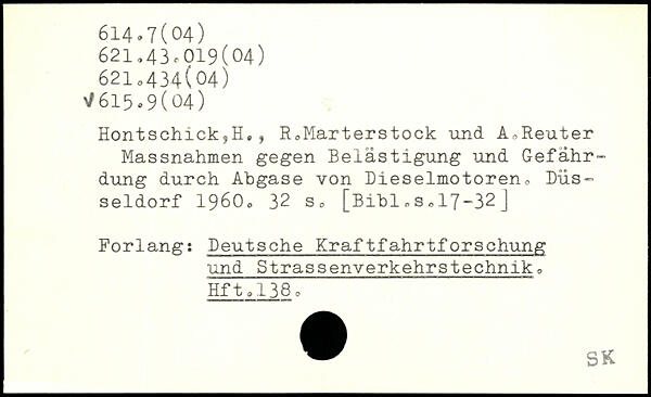 Hontschick,H,, RoMarterstock und AoReuter Massnahmen gegen Belästigung und Gefährdung durch Abgase von Dieselmotoren,, Düsseldorf 1960o