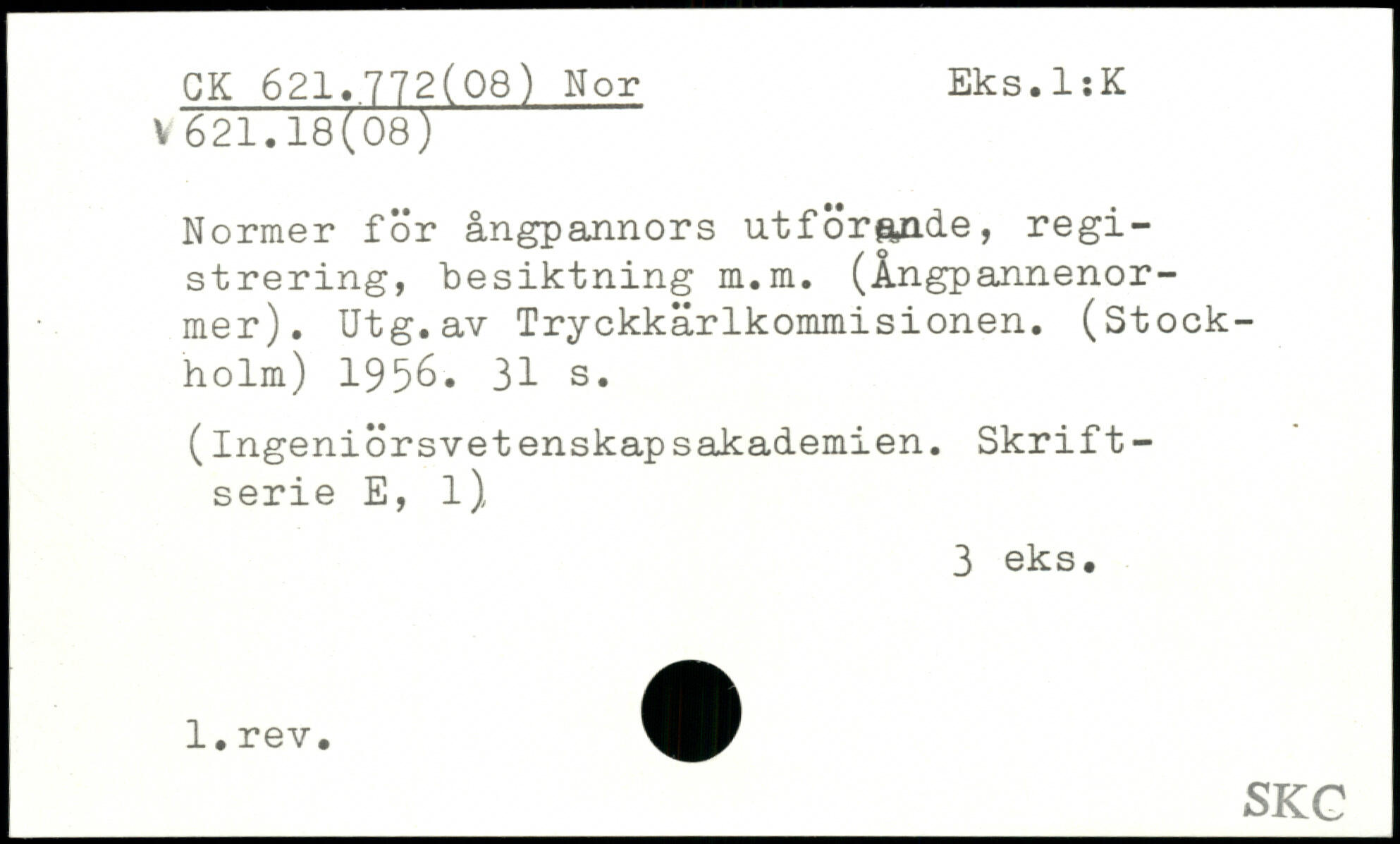 Normer för ångpannors utförande, registrering, besiktning m.m. (Ångpannenor-mer). Utg.av Tryckkärlkommisionen. (Stockholm) 1956.