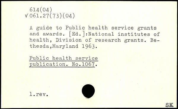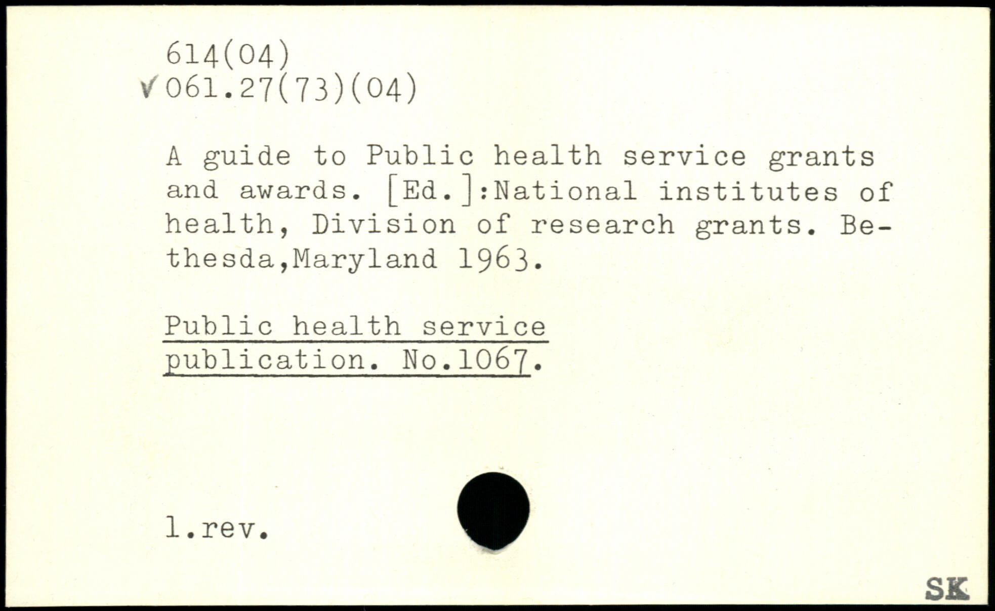 A guide to Public health service grants and awards. [Ed.]:hational institutes of health, Division of research grants. Be-thesda,Maryland 1963. Public health service publication. N0.1067.