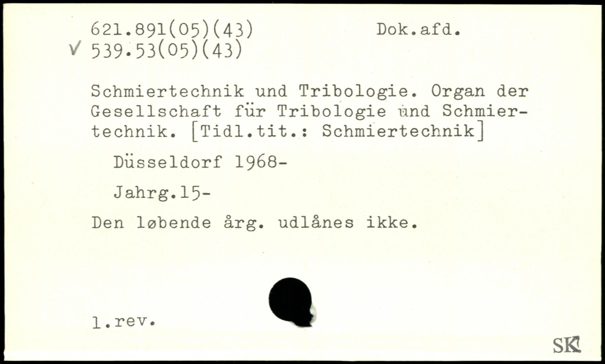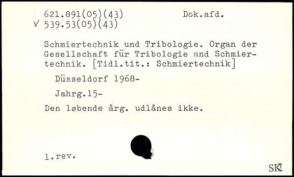 Schmiertechnik und Tribologie. Organ der Gesellschaft für Tribologie und Schmiertechnik. [Tidl.tit.s Schmiertechnik] Düsseldorf 1968- Jahrg.15- Den løbende årg. udlånes ikke. _