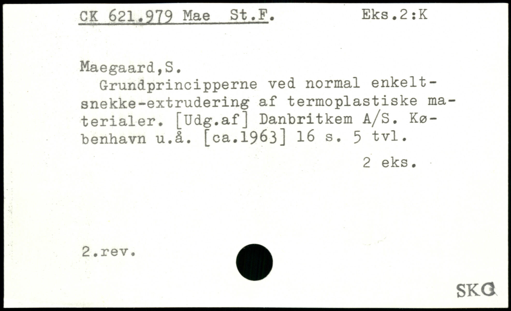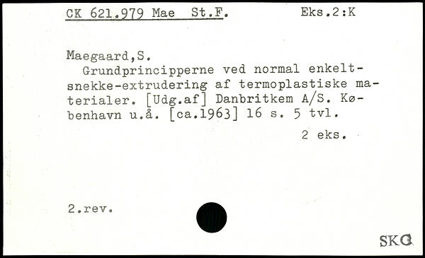 Grundprincipperne ved normal enkelt-snekke-extrudering af termoplastiske materialer. [Udg.af] Danbritkem A/S. København u.å. [ca.1963]