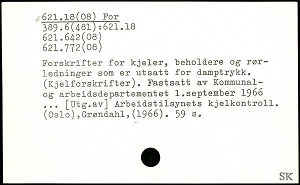 Forskrifter for kjeler, beholdere og rørledninger som er utsatt for damptrykk. (Kj elforskrifter). Fastsatt av Kommunal-og arbeidsdepartementet 1.september 1966 ... [Utg.av] Arbeidstilsynets kjelkontroll. (Oslo),Grøndahl,(1966).