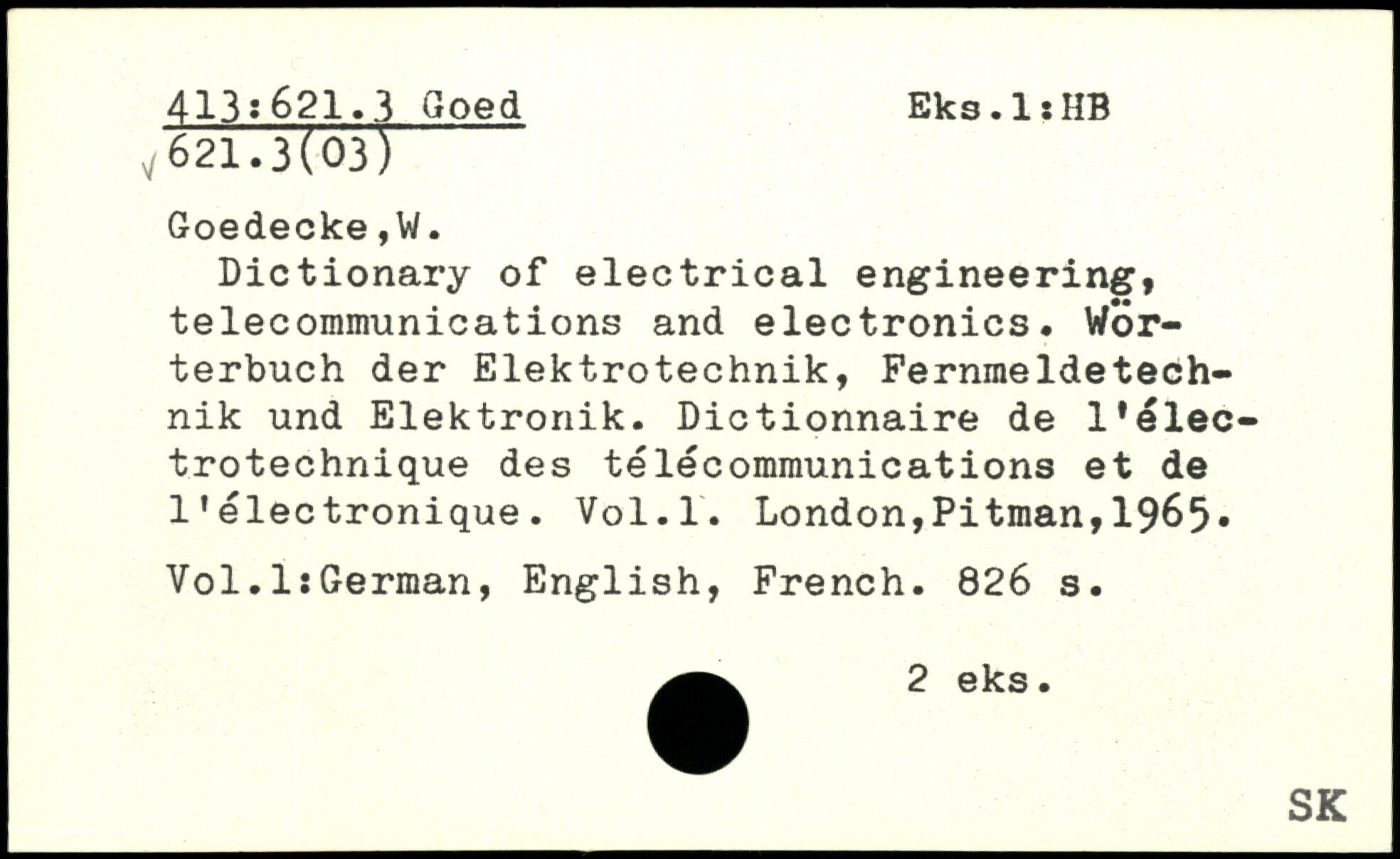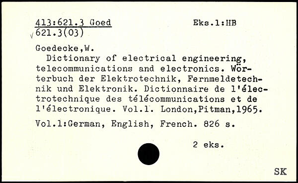 Dictionary of electrical engineering, telecommunications and electronics. Wörterbuch der Elektrotechnik, Fernmeldetechnik und Elektronik. Dictionnaire de l'électrotechnique des télécommunications et de l'électronique.