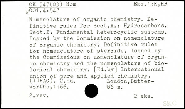 Nomenclature of organic chemistry. Definitive rules for Sect.A.: Hydrocarbons. Sect.B: Fundamental heterocyclic sustems. Issued hy the Commission on nomenclature of organic chemistry. Definitive rules for nomenclature of steroids. Issued by the Commissions on nomenclature of organic chemistry and the nomenclature of biological chemistry. [Ed.by] International union of pure and applied chemistry, (IUPAC). ^.ed.