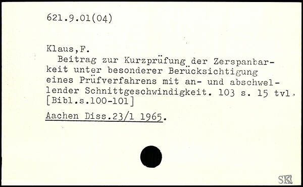 Beitrag zur Kurzprufung der Zerspanbarkeit unter besonderer Berücksichtigung eines Prüfverfahrens mit an- und abschwellender Schnittgeschwindigkeit.