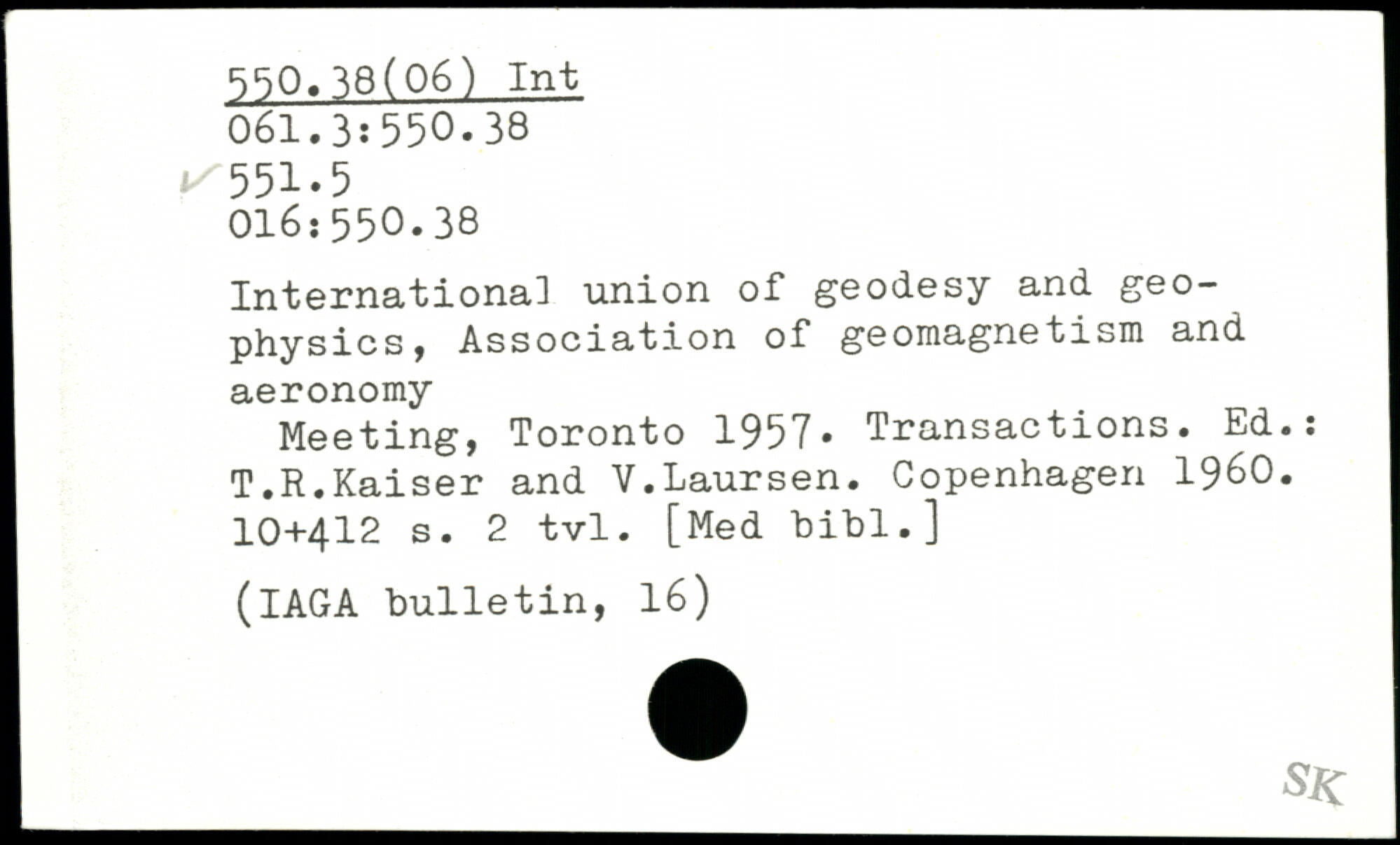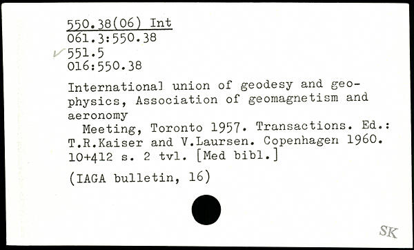 Internationa] union of geodesy and geophysics, Association of geomagnetism and aeronomy Meeting, Toronto 1957, Transactions. Ed.: T.R.Kaiser and V.Laursen.
