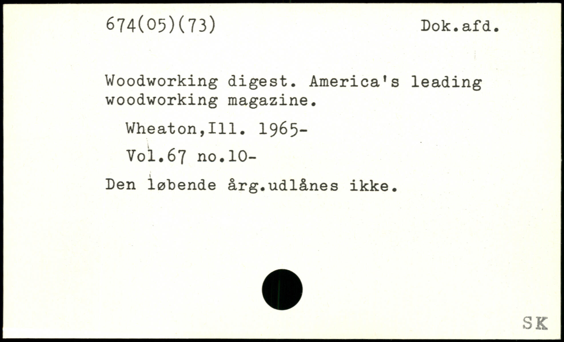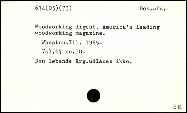 Woodworking digest. America’s leading woodworking magazine. Wheaton,111. 19&5- Voi.67 no.10- Den løbende årg.udlånes ikke.