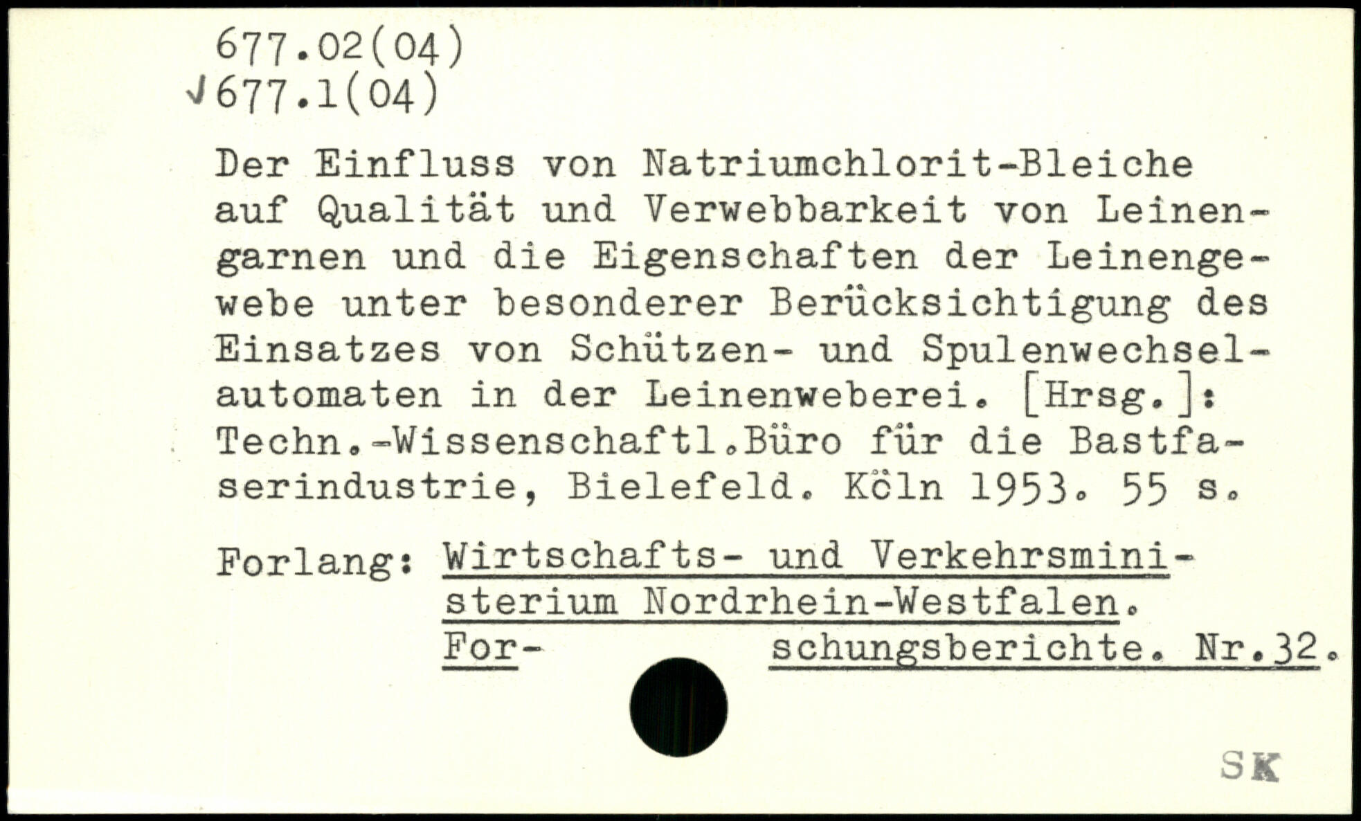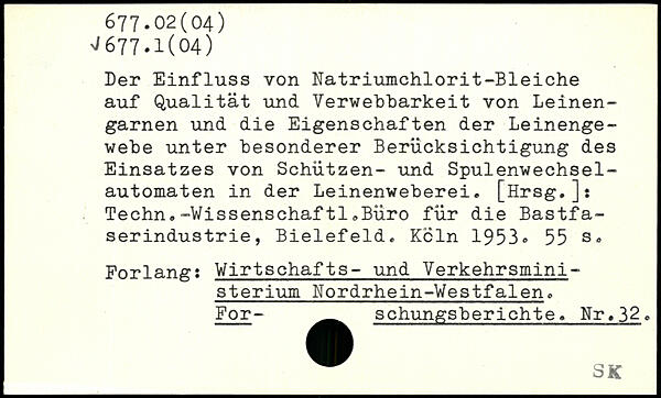 Der Einfluss von Natriumchlorit-Bleiche auf Qualität und Verwebbarkeit von Leinengarnen und die Eigenschaften der Leinengewebe unter besonderer Berücksichtigung des Einsatzes von Schützen- und Spulenwechselautomaten in der Leinenweberei. [Hrsg.]: Techn.-Wissenschaftl.Büro für die Bastfaserindustrie, Bielefeld.