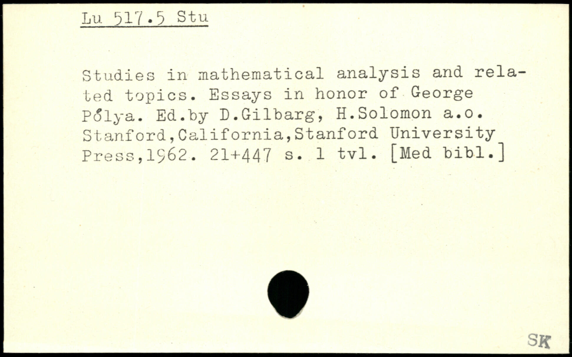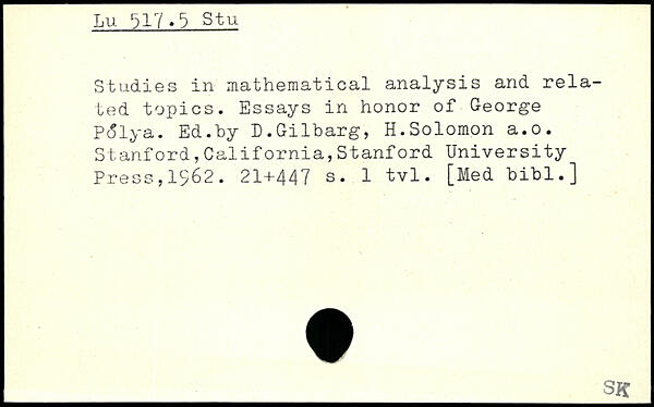 Studies in mathematical analysis and related topics. Essays in honor of George PcSlya. Ed.hy D.Gilbarg, H.Solomon a.o.