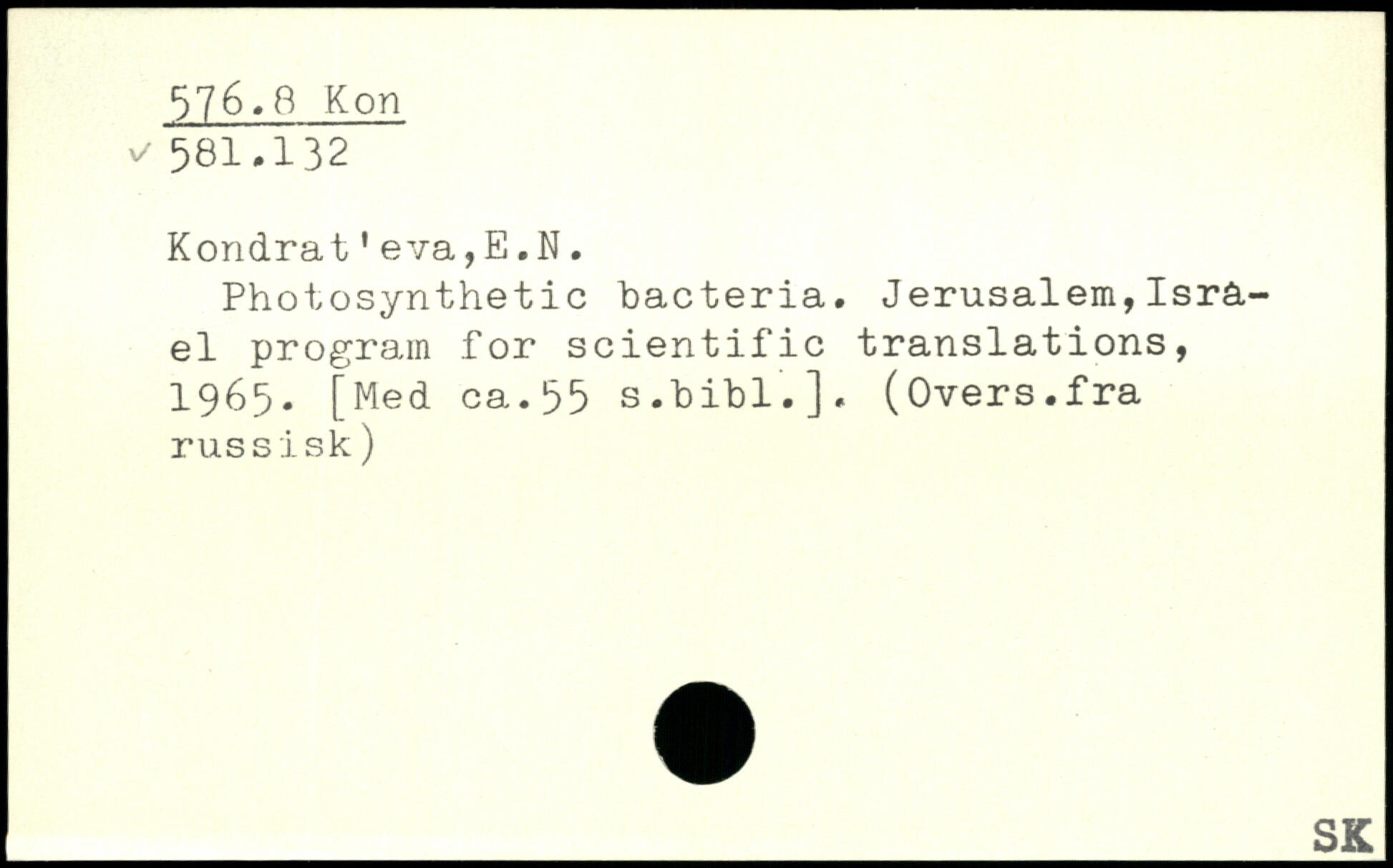 Kondrat'eva, E ,N. Photosynthetic bacteria. Jerusalem,Israel program for scientific translations, 1965. [Med ca.