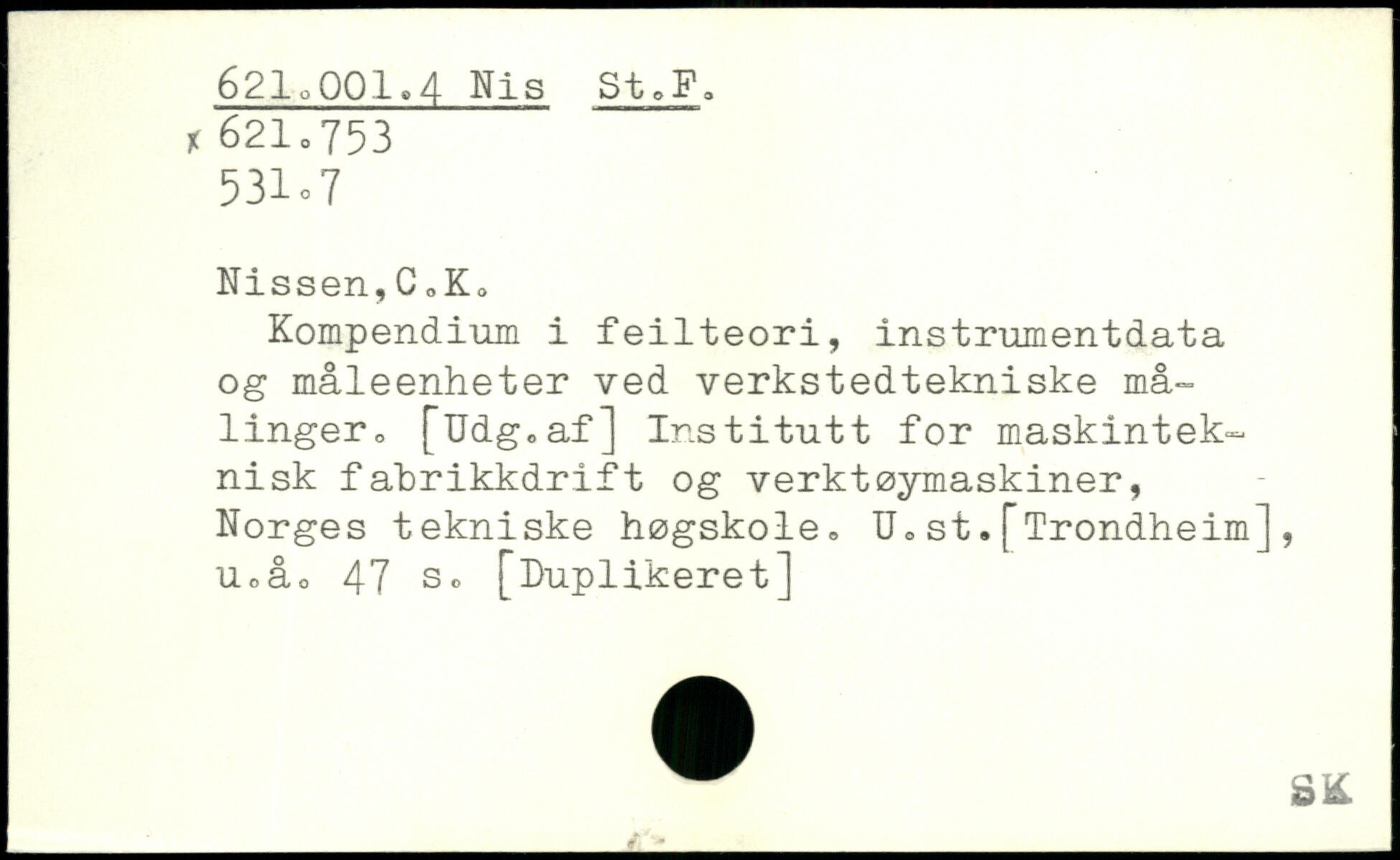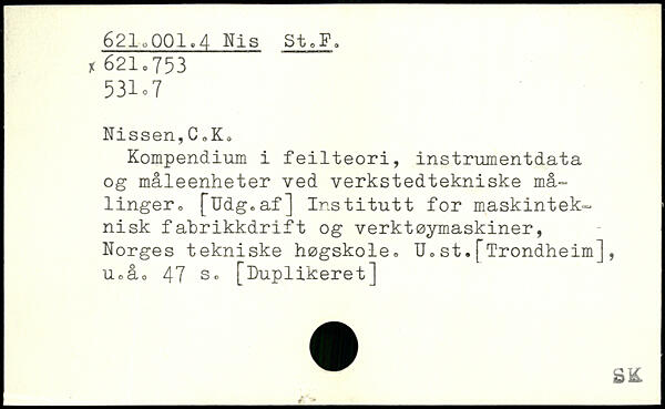 Kompendium i feilteori, instrumentdata og måleenheter ved verkstedtekniske målinger o [Udg.af] Institutt for maskinteknisk fahrikkdrift og verktsymaskiner, Norges tekniske høgskole, U=st.[Trondheim], Uoåo