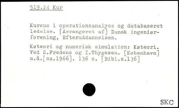 Kursus i operationsanalyse og databaseret ledelse. [Arrangeret af] Dansk ingeniørforening, Efteruddannelsen. Køteori og numerisk simulation: Køteori. Ved S.Fredens og I.Thygesen.