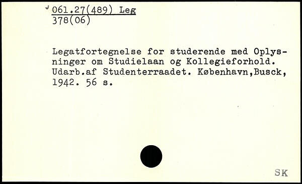 Legatfortegnelse for studerende med Oplysninger om Studielaan og Kollegieforhold. Udarb.af Studenterraadet.