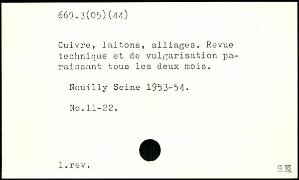 Cuivre, laitons, alliages. Revue technique et de vulgarisation paraissant tous les deux mois. Neuilly Seine 1953— 54. No.11-22. i.rev. gs