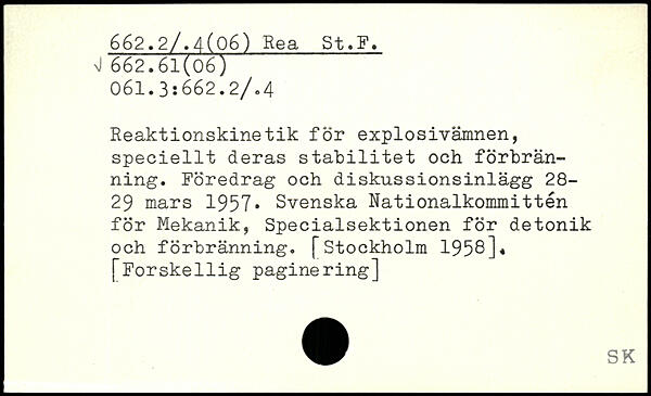 Reaktionskinetik för explosivämnen, speciellt deras stabilitet och förbränning. Föredrag och diskussionsinlägg 28-29 mars 1957. Svenska Nationalkommittén för Mekanik, Specialsektionen för detonik och förbränning.
