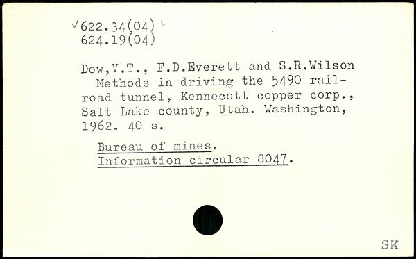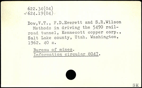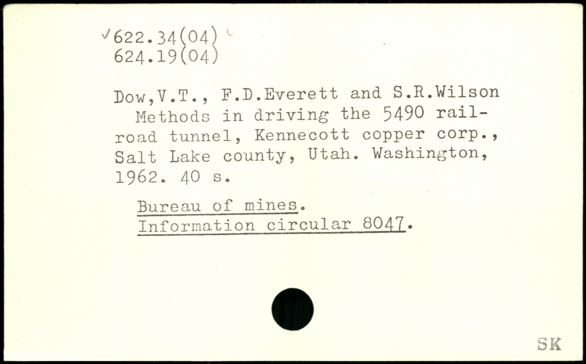 Dow,V.T., F.D.Everett and S.R.Wilson Methods in driving the 5490 railroad tunnel, Kennecott copper corp., Salt Lake county, Utah. Washington, 1962.