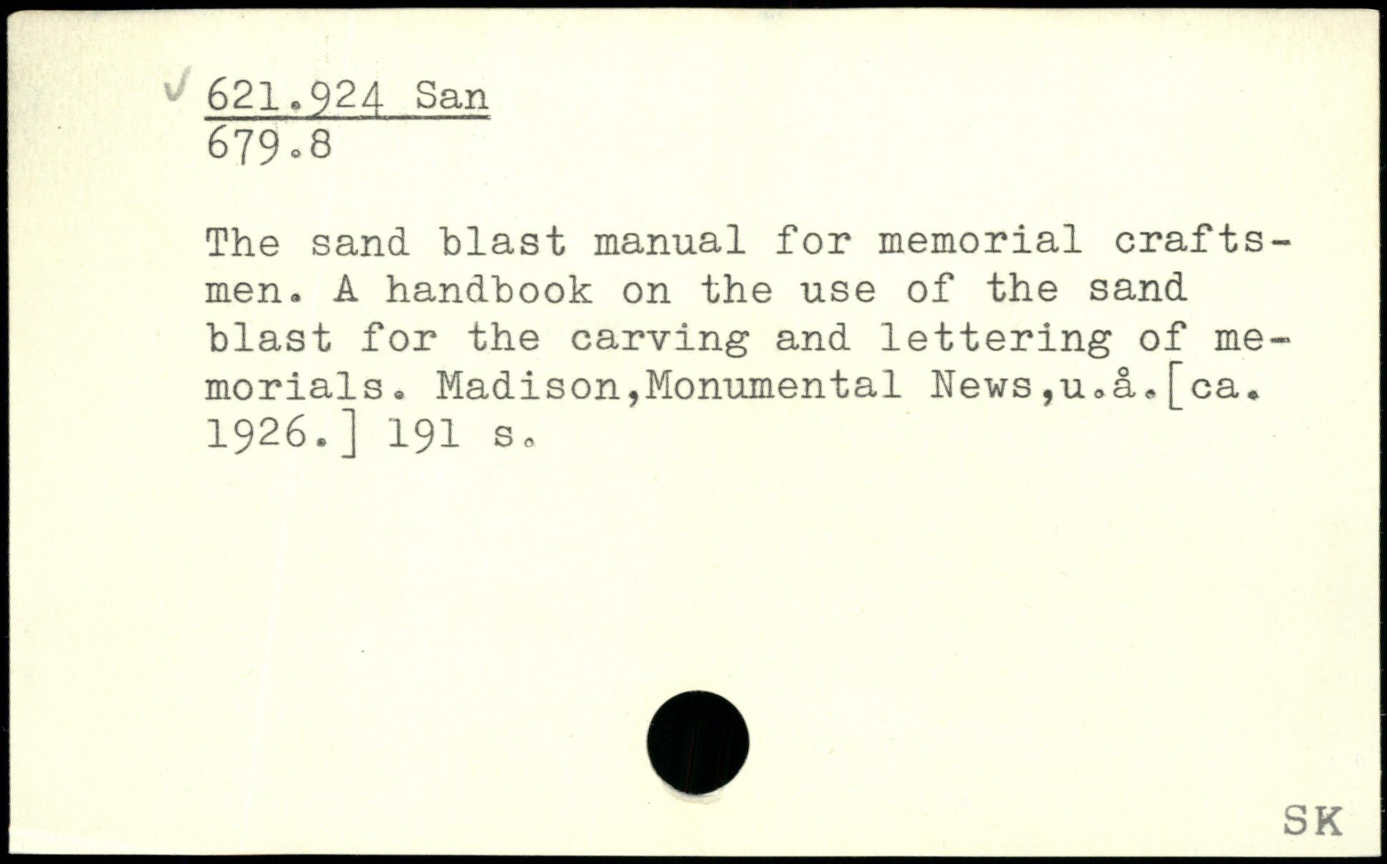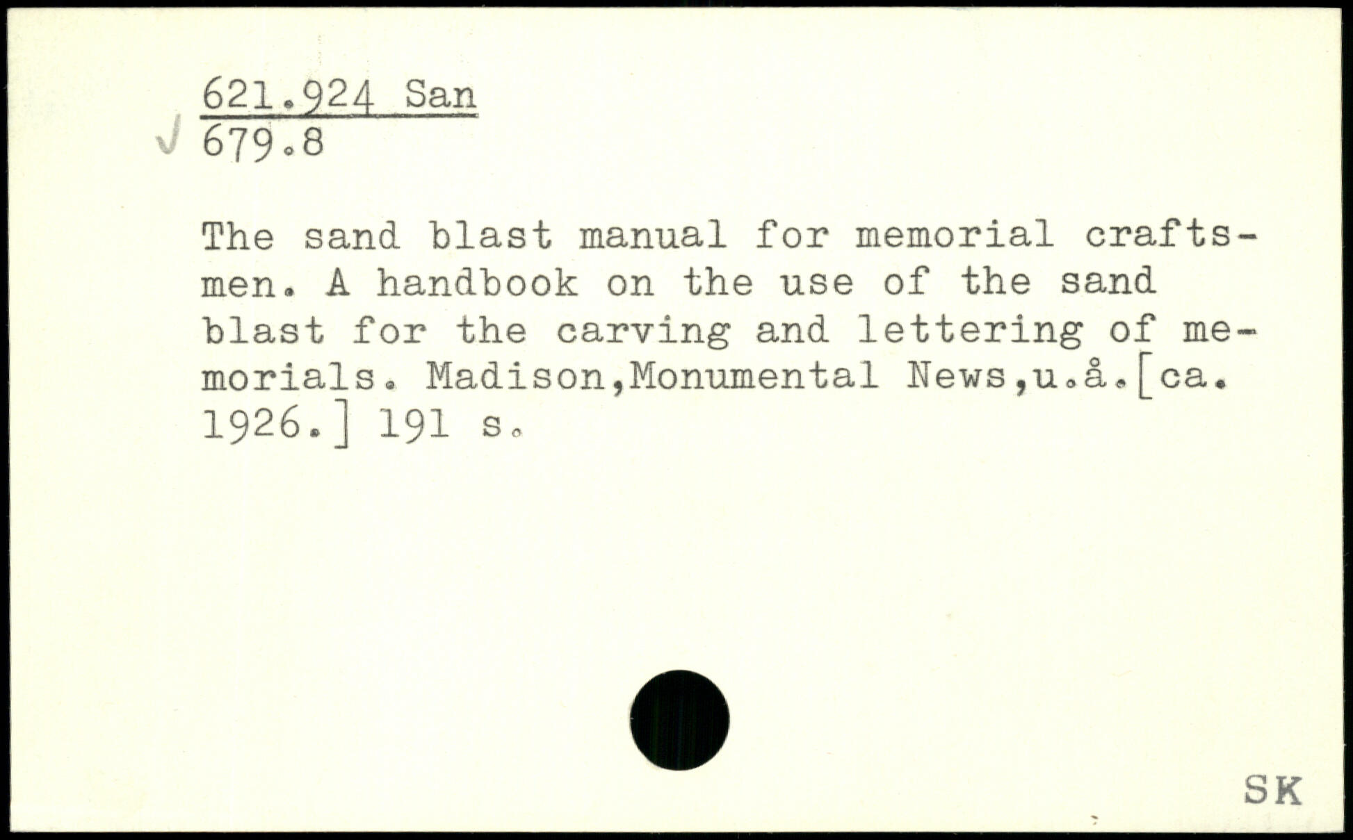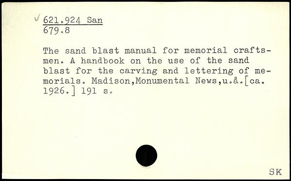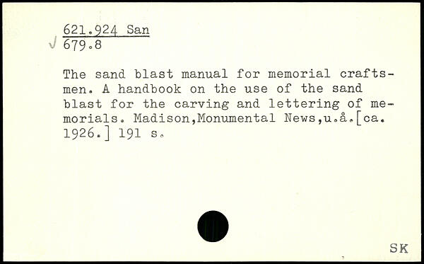 The sand blast manual for memorial craftsmen. A handbook on the use of the sand blast for the carving and lettering of memorials. Madison,Monumental hews,u,a,[ca. 1926.]