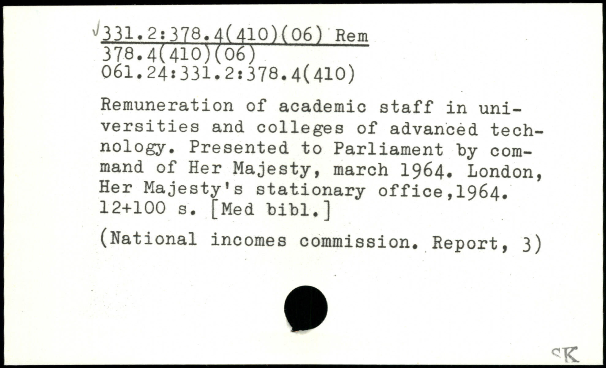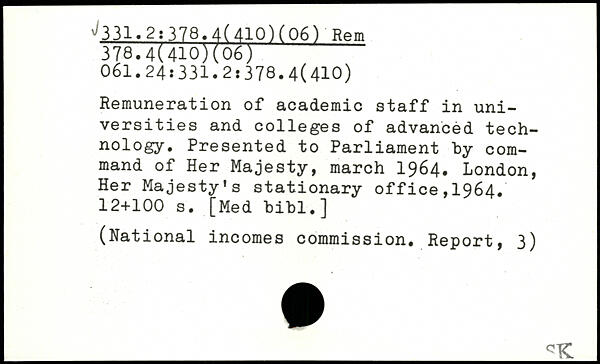 Remuneration of academic staff in universities and colleges of advanced technology. Presented to Parliament by command of Her Majesty, march 1964. London, Her Majesty's stationary office,1964.