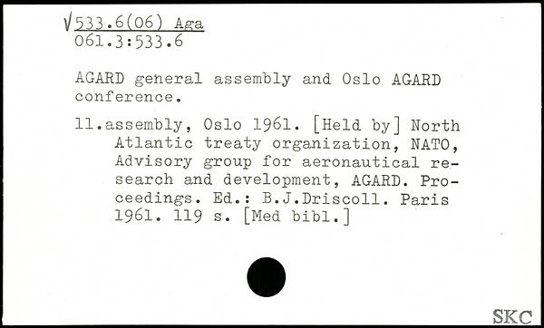 AGARD general assembly and Oslo AGARD conference. 11.assembly, Oslo 1961. [Held by] North Atlantic treaty organization, NATO, Advisory group for aeronautical research and development, AGARD. Proceedings. Ed.: B.J.Driscoll.