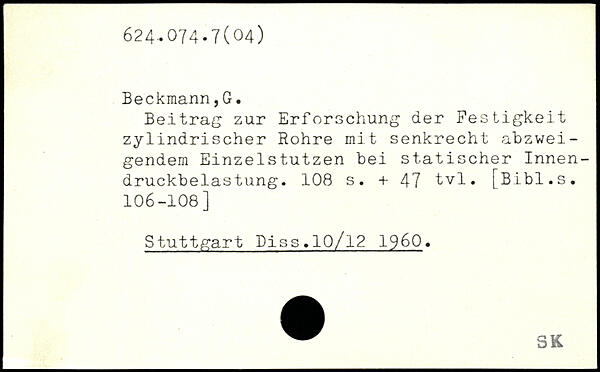 Beitrag zur Erforschung der Festigkeit zylindrischer Rohre mit senkrecht abzweigendem Einzelstutzen bei statischer Innendruckbelastung.