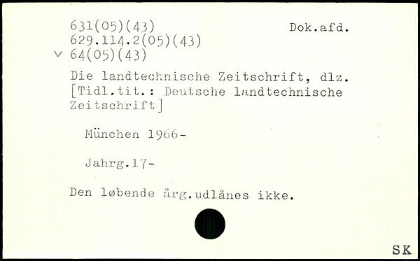Die landtechnische Zeitschrift, dlz. [Tidl.tit.: Deutsche landtechnische Zeitschrift ] München IJbb- Jahrg.17- Den løbende arg.udlånes ikke.
