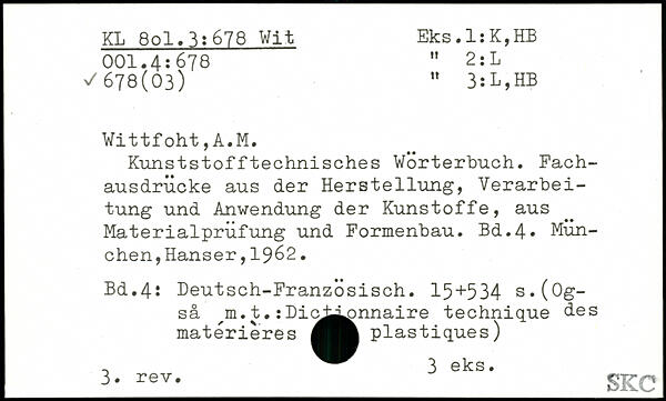 Kunststofftechnisches Wörterbuch. Fach-ausdrücke aus der Herstellung, Verarbeitung und Anwendung der Kunstoffe, aus Materialprüfung und Formenbau.