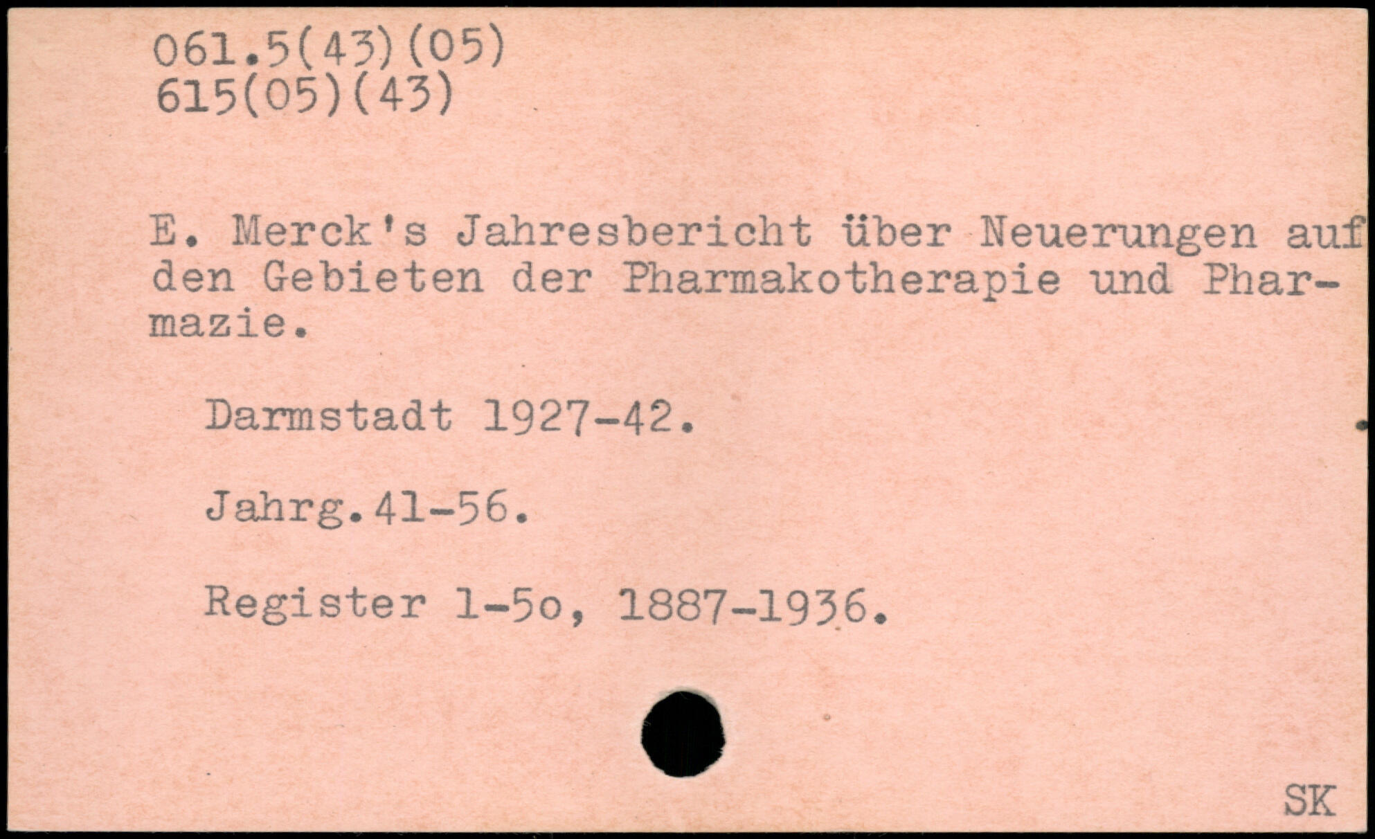 E. Merck’s Jahresbericht über Neuerungen auf den Gebieten der Pharmakotherapie und Pharmazie. Darmstadt 1927-42. Jahrg.41-56. Register l-5o, 1887-1936.