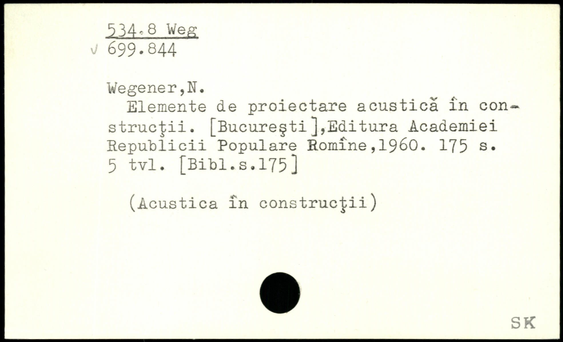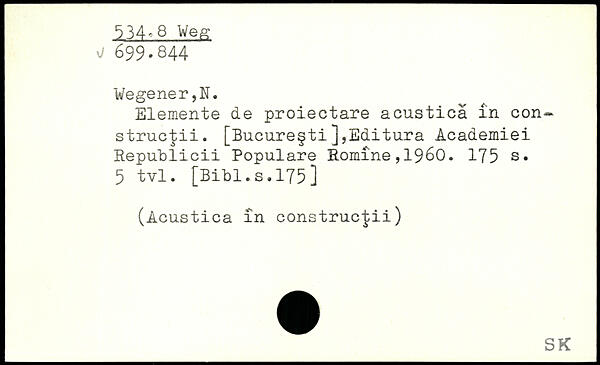 Elemente de proiectare acusticä in con~ struc^ii. [Bucure§ti],Editura Academiei Republicii Populäre Romine,1960.