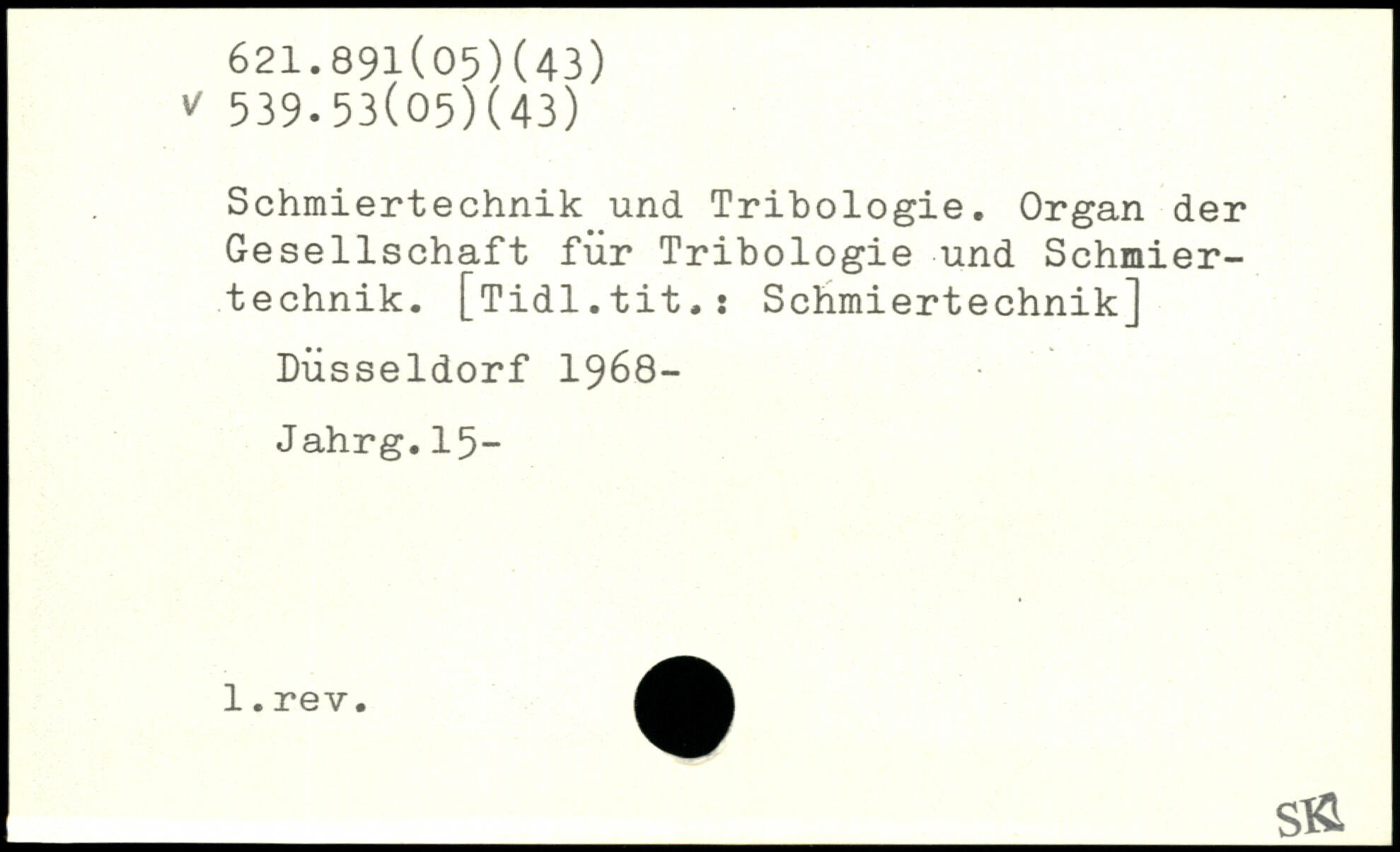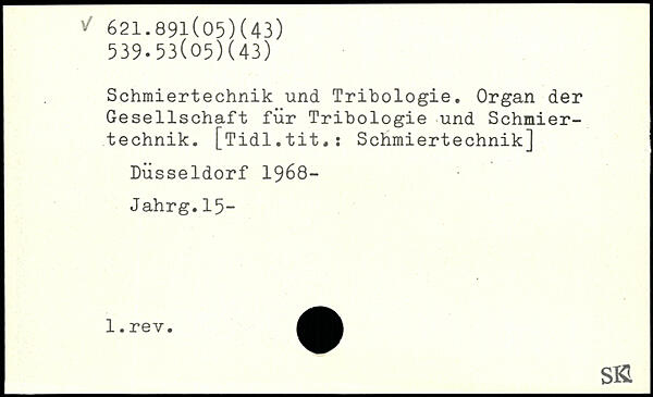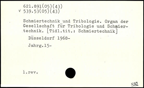 Schmiertechnik und Tribologie. Organ der Gesellschaft für Tribologie und Schmiertechnik. [Tidl.tit.: Schmiertechnik] Düsseldorf 1968- Jahrg.15-