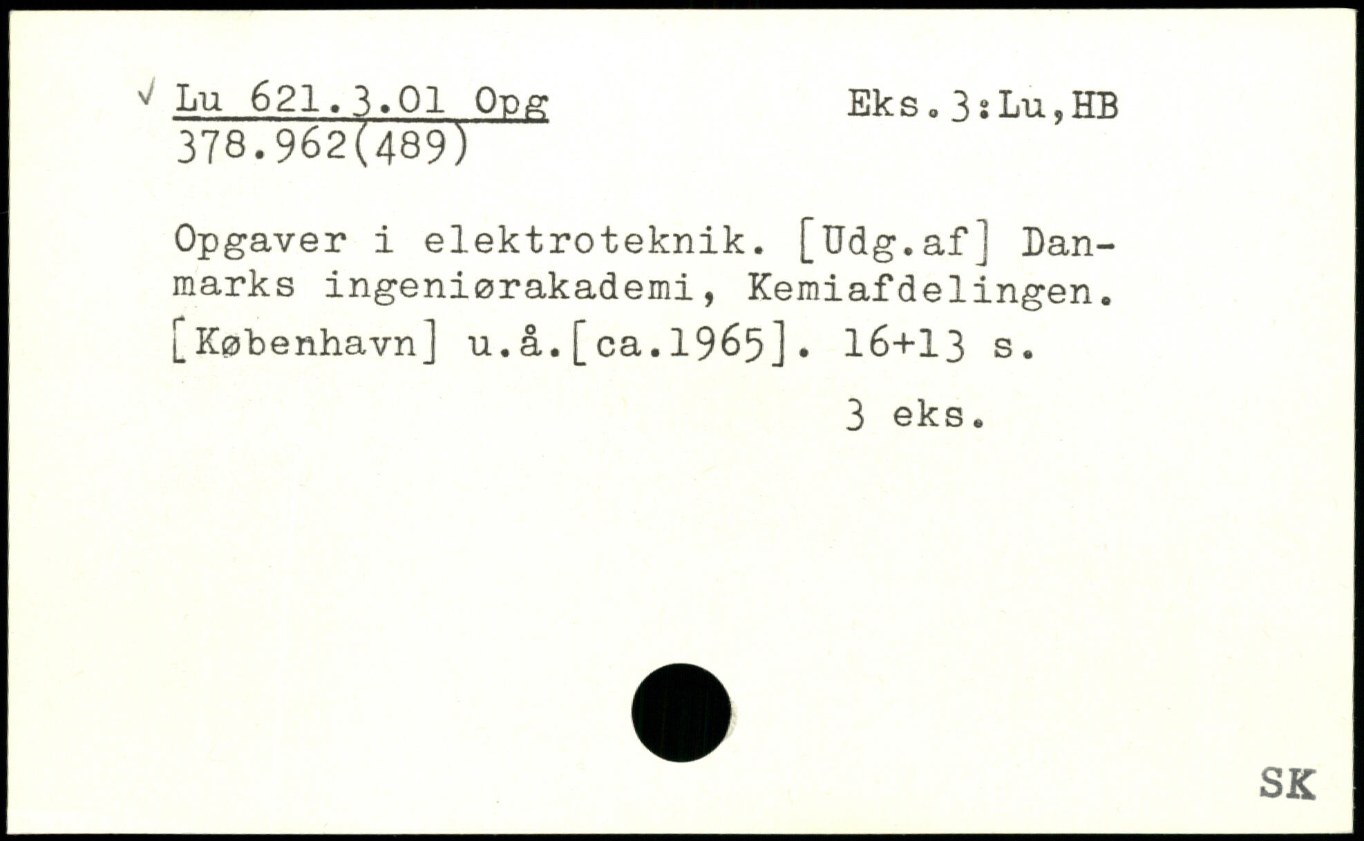 Opgaver i elektroteknik. [Udg.af] Danmarks ingeniørakademi, Kemiafdelingen. l_København] u. å. [ ca. 1965].