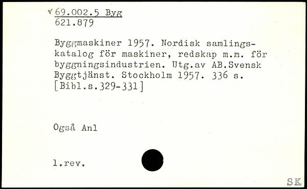 Bygftmaskiner 1957, Nordisk samlingskatalog for maskiner, redskap m.m. for "byggningsindustrien. Utg.av AB. Svensk Byggtjånst.