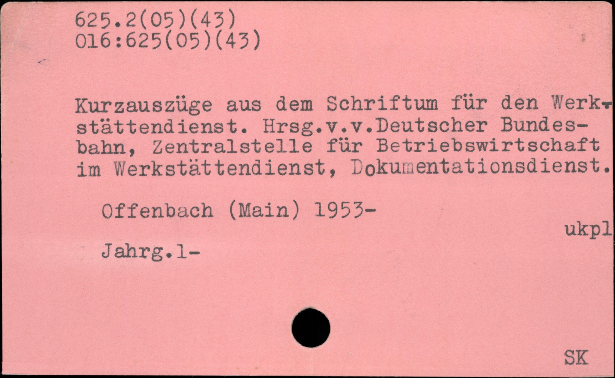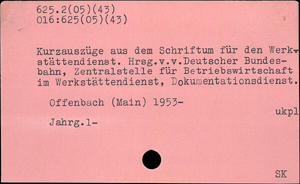 Kurzauszüge aus dem Schriftum für den Werk, Stättendienst. Hrsg.v.v.Deutscher Bundes-bahn, Zentralstelle für Betriebswirtschaft im Werkstättendienst, Dokumentationsdienst. Offenbach (Main) 1953- ukpl Jahrg.l-