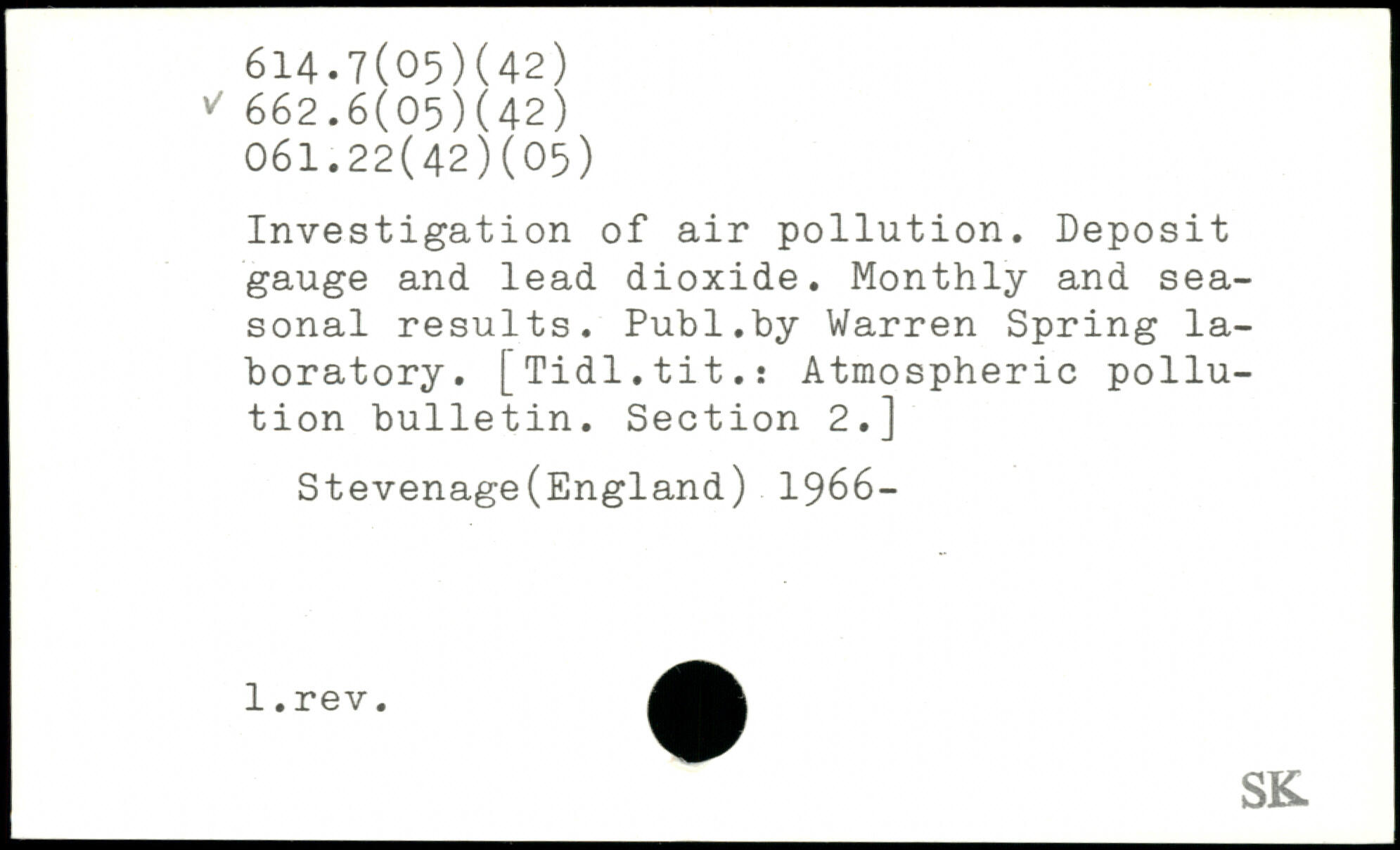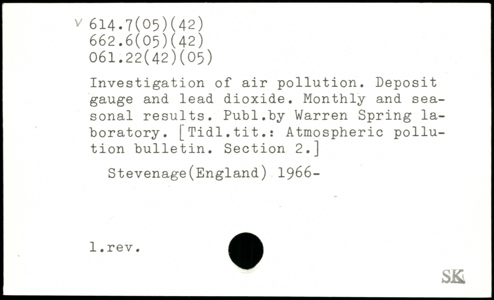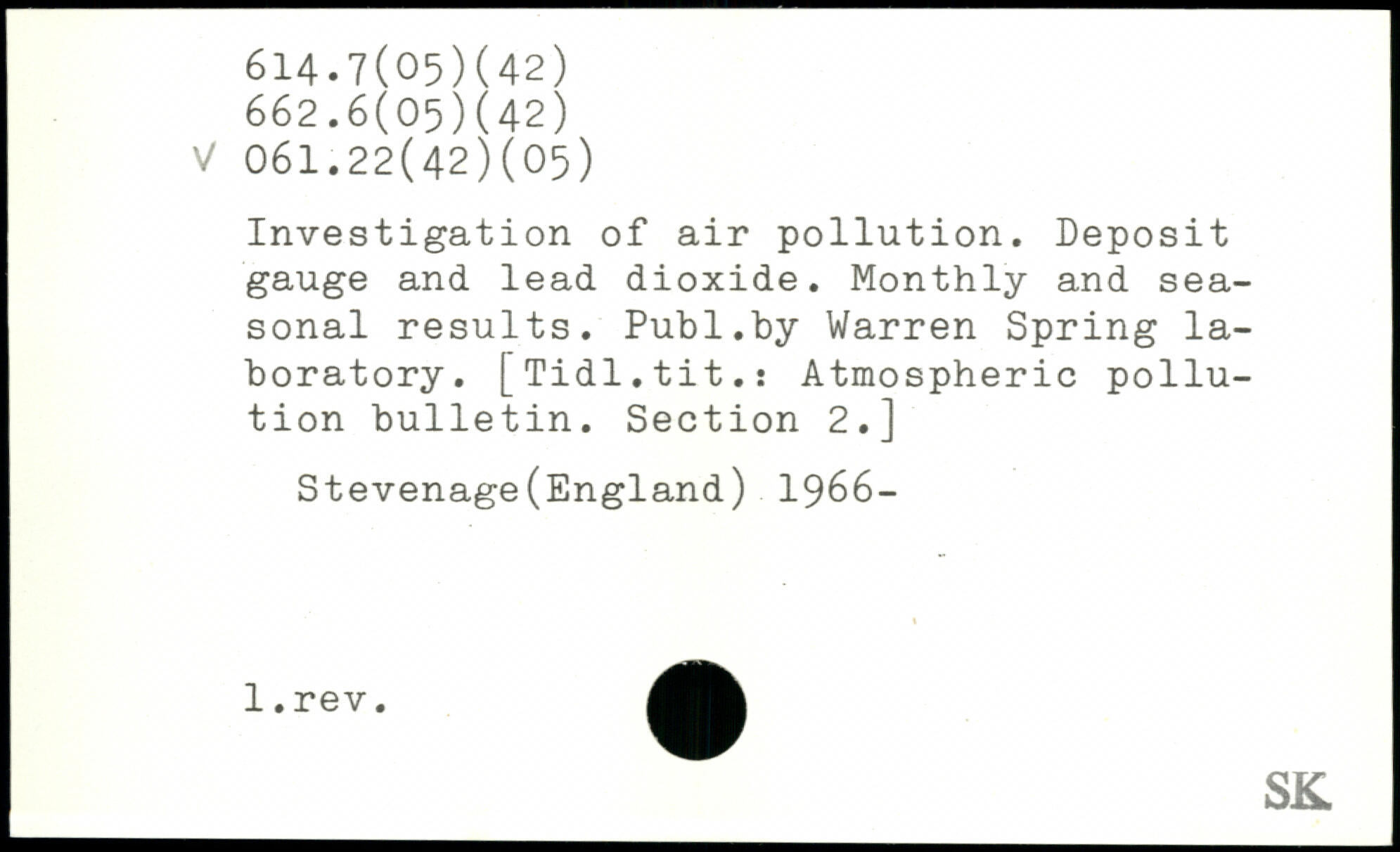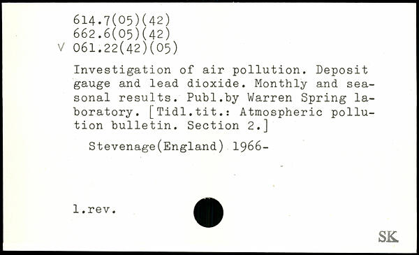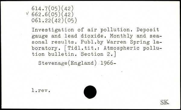 Investigation of air pollution. Deposit gauge and lead dioxide. Monthly and seasonal results.