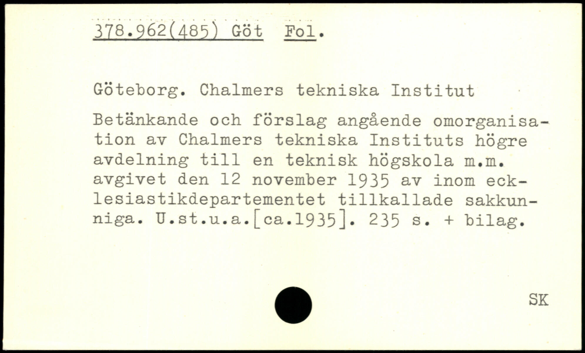 Göteborg. Chalmers tekniska Institut Betänkande och förslag angående omorganisation av Chalmers tekniska Instituts högre avdelning till en teknisk högskola m.m. avgivet den 12 november 1935 av inom ecklesiastikdepartementet tillkallade sakkunniga. U.st.u.a.[ca.1935].